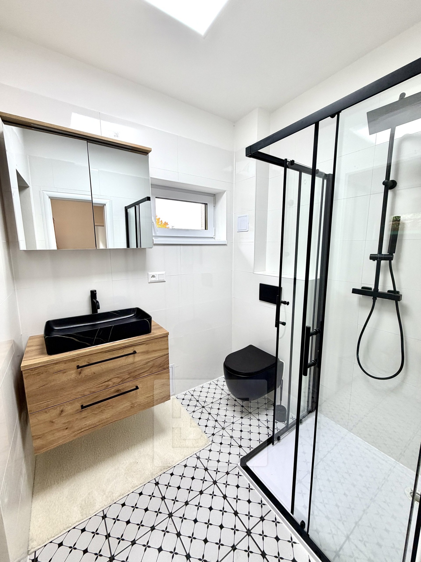 • designová italská koupelna (černo-bílý interiér): sprchový kout, umyvadlo, WC