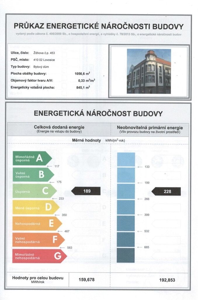 - Ukazatel energetické náročnosti budovy: 189 kWh/m²
