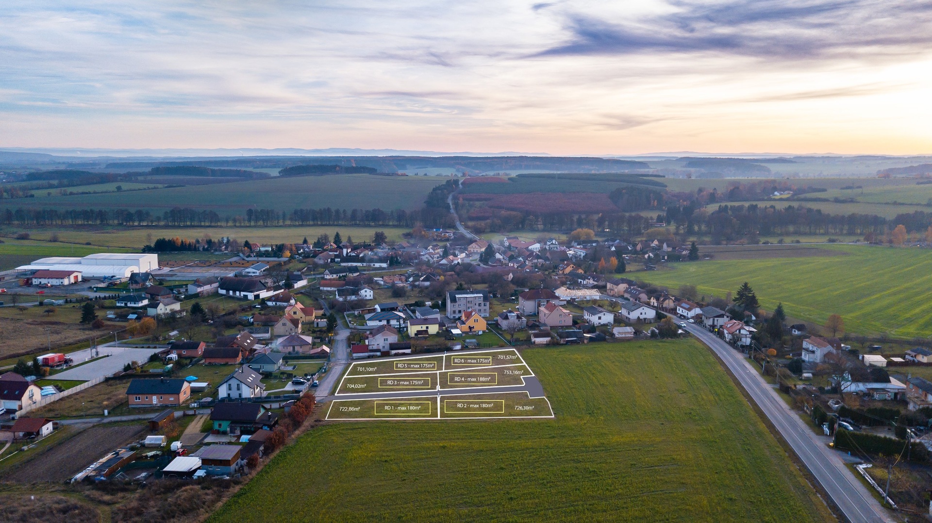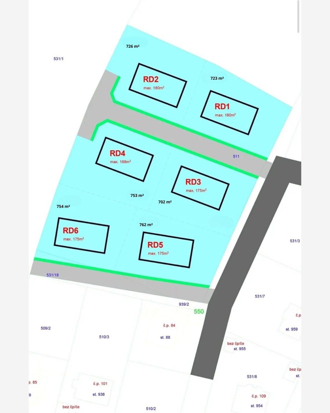5 bunglalovů velikosti 4 kk užitné plochy 98.3 m2 pozemky o velikosti 726 m2 - 762 m2