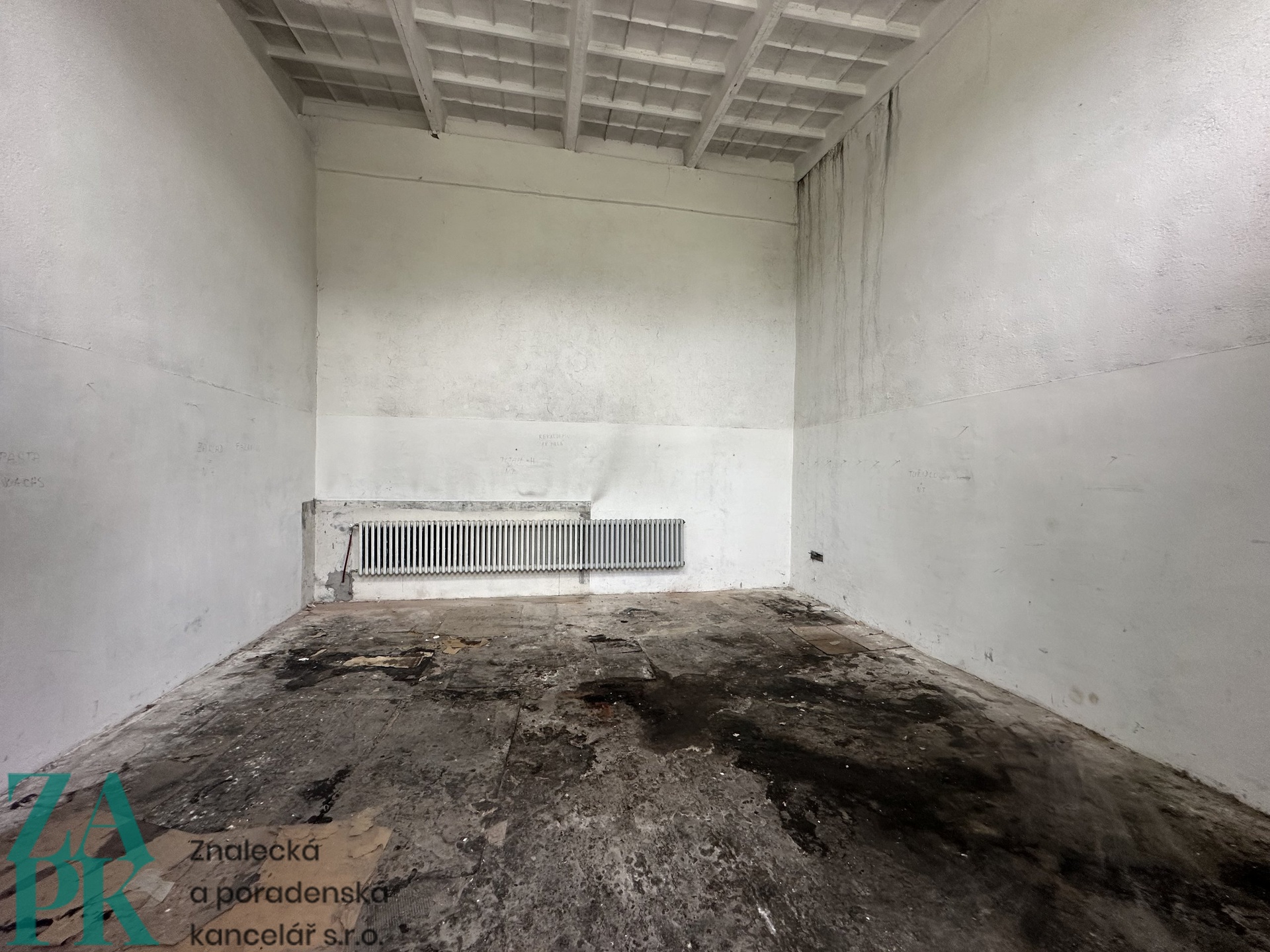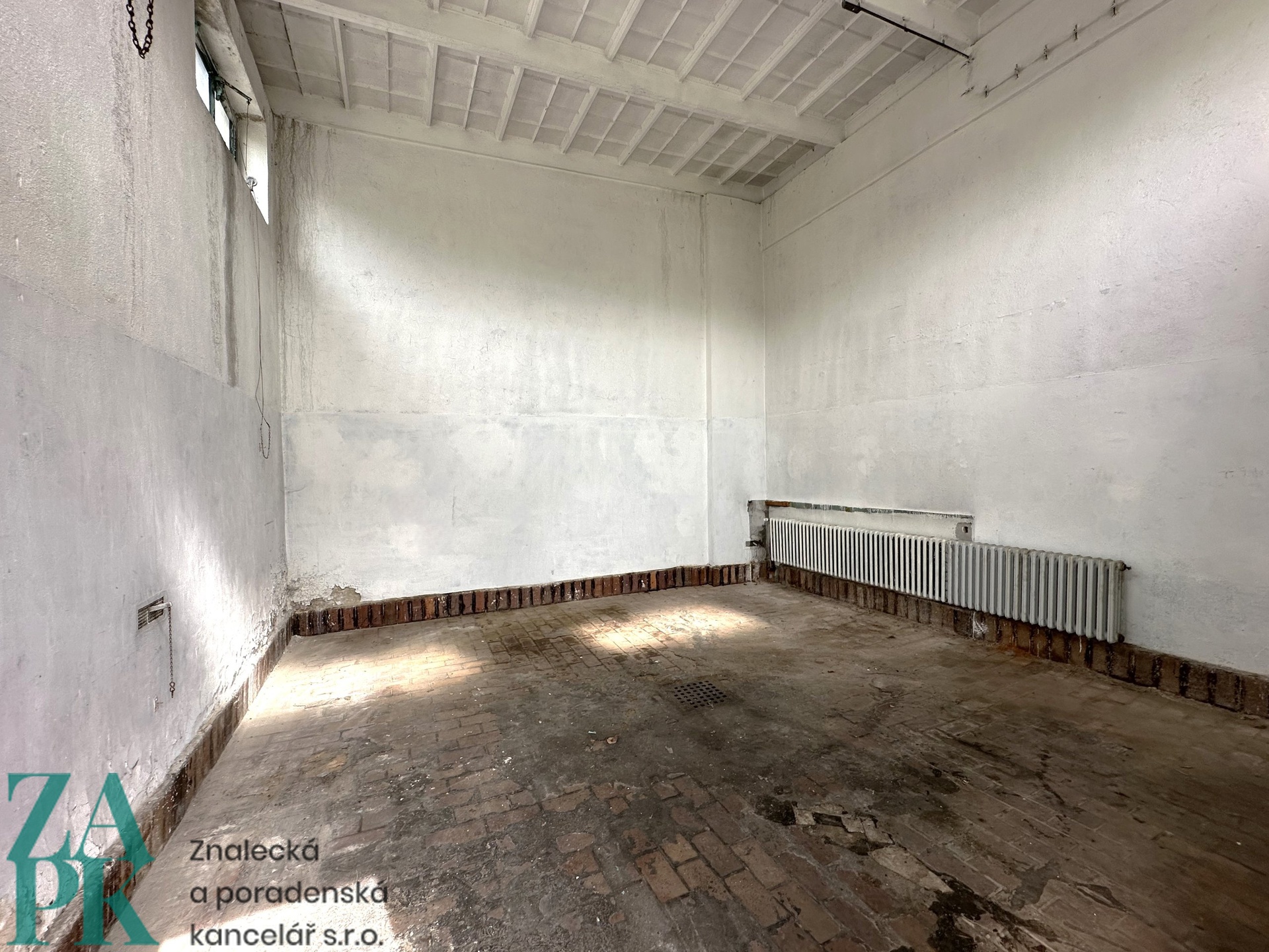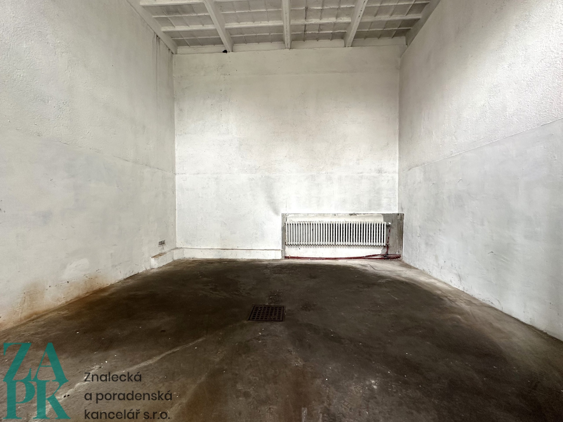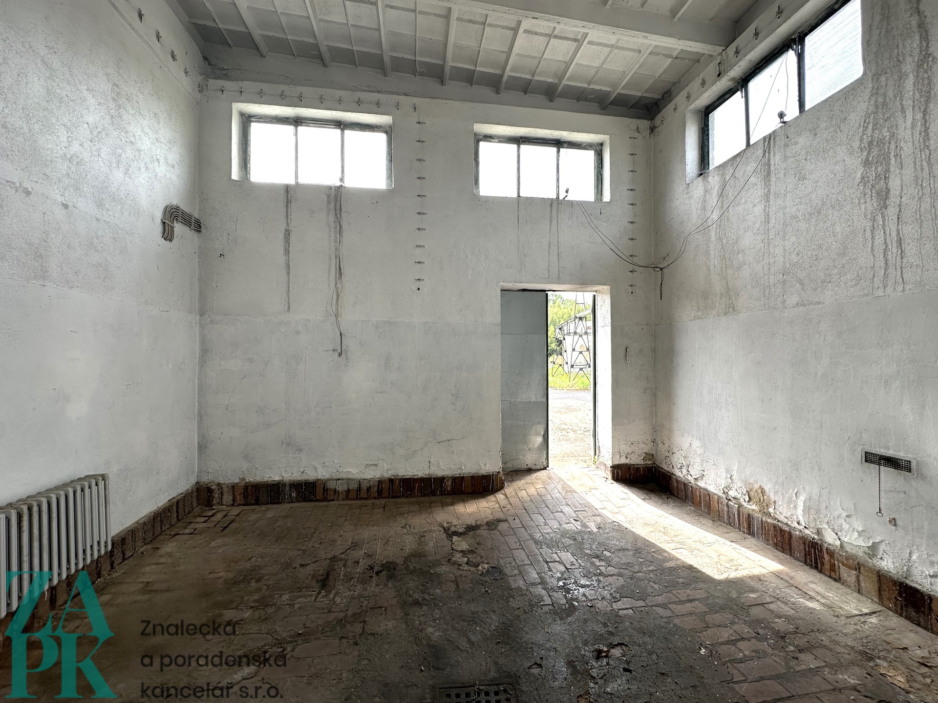 2x prostor v přední části: v=5,0 m, š=5,7 m, hl=5,6 m, každý sklad má vlastní vrata š=1,4 m, v=2,55 m