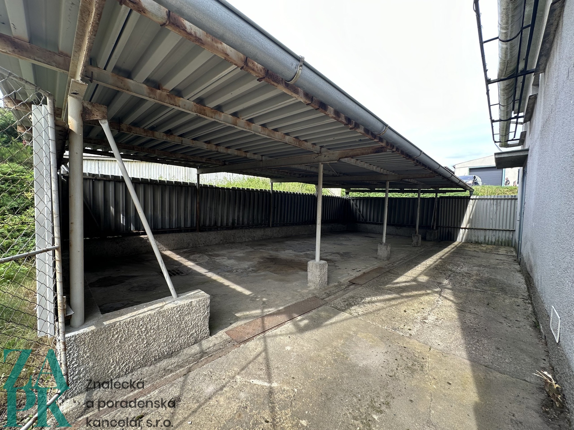 2x plechový přístřešek: z levé a pravé strany budovy jsou přístřešky s velikostí 80 m2