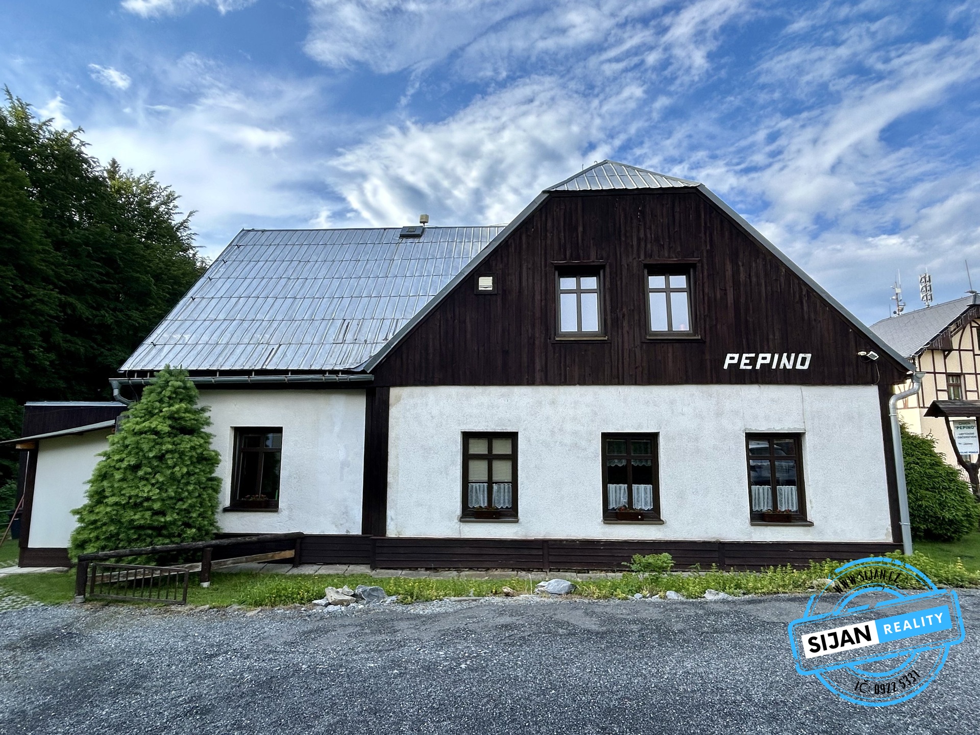 Součástí nabídky jsou i vizualizace přestavby penzionu na moderní apartmány s wellness a barem, které naznačují možný směr rozvoje této atraktivní nemovitosti.