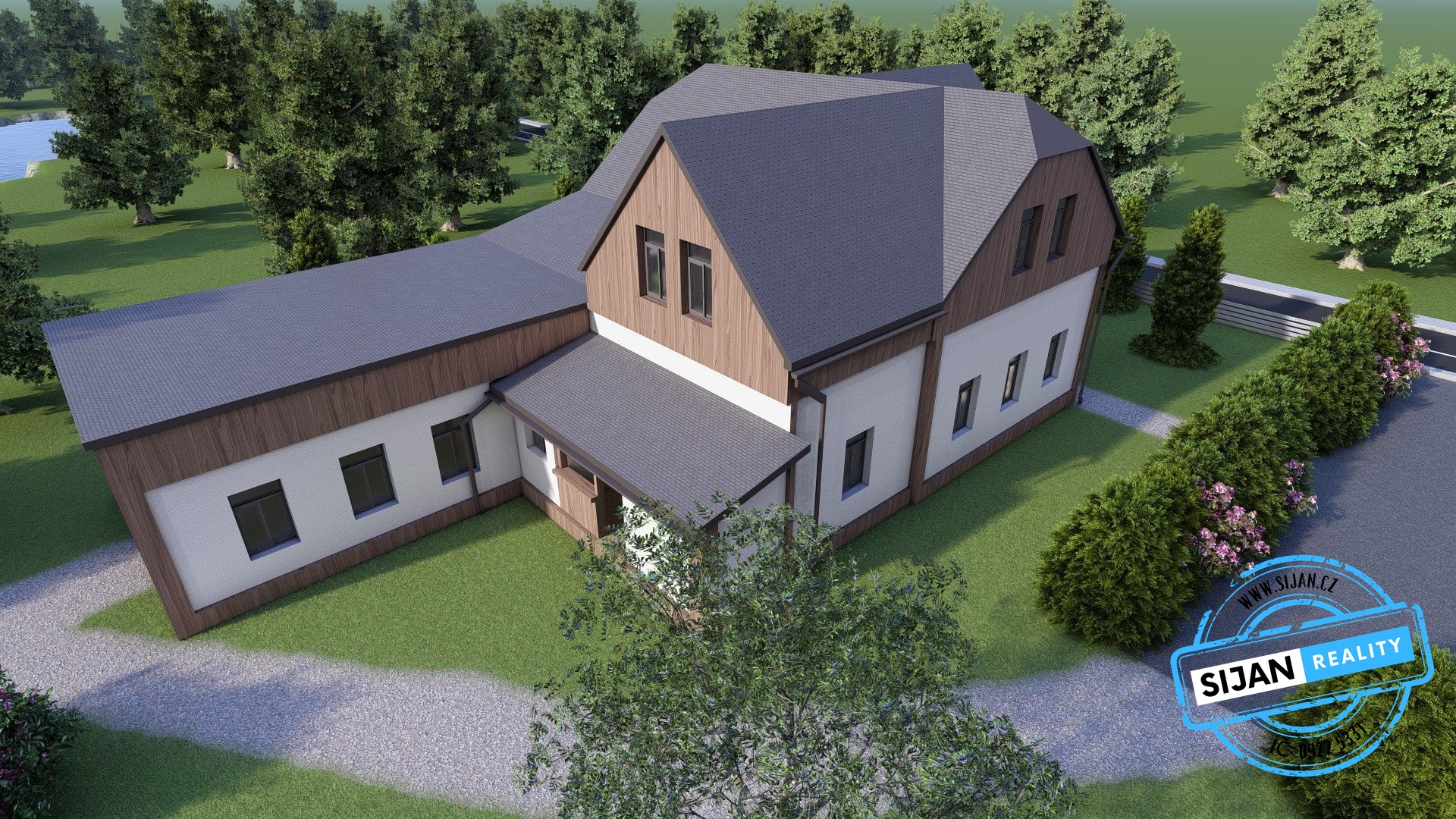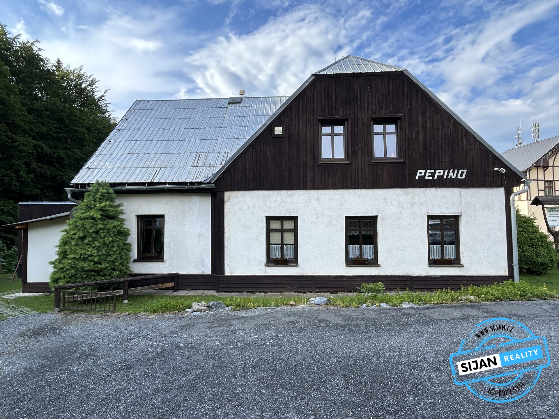 Součástí nabídky jsou i vizualizace přestavby penzionu na moderní apartmány s wellness a barem, které naznačují možný směr rozvoje této atraktivní nemovitosti.