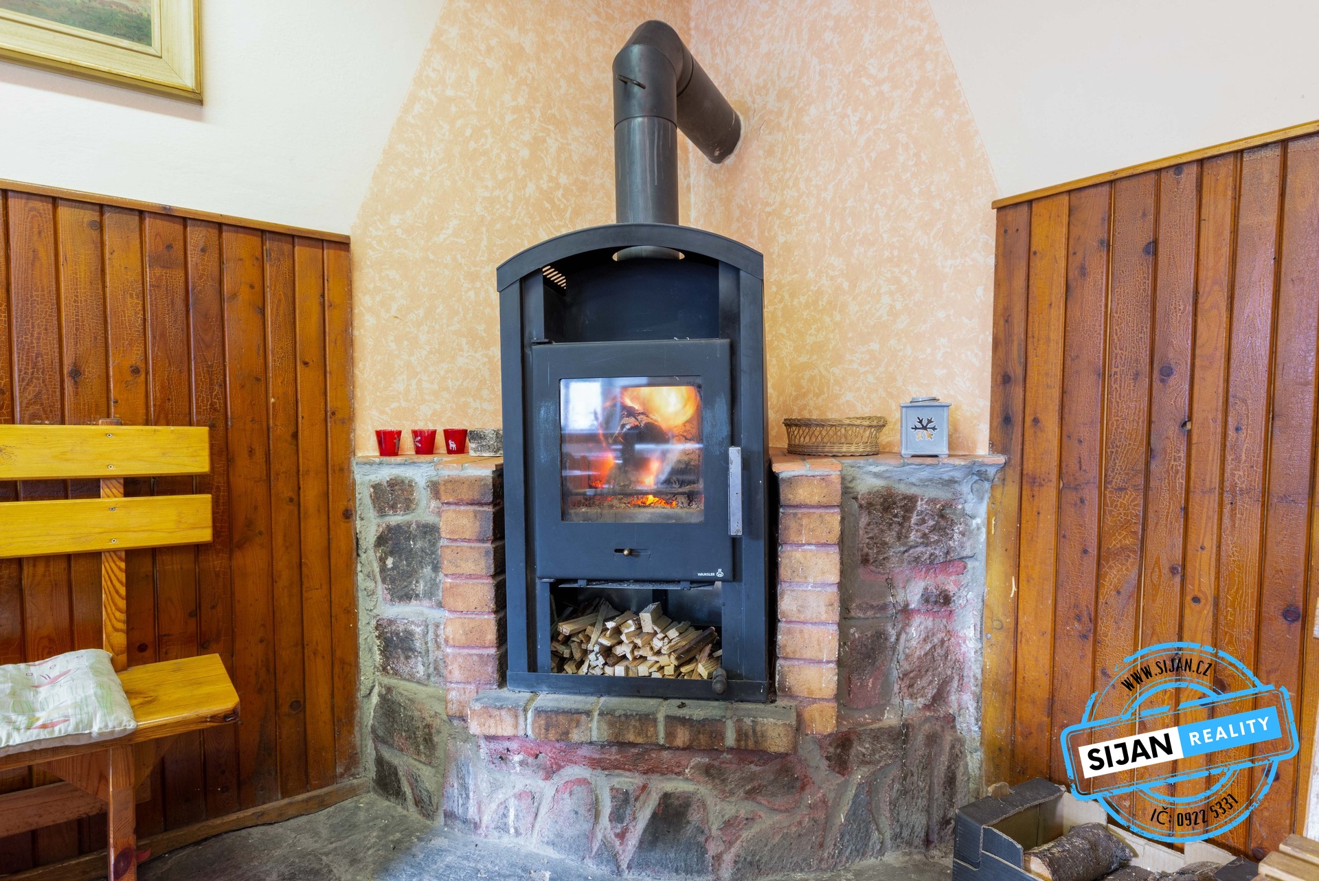 V přízemí najdete stylové posezení s krbem a barem, ideální pro večerní pohodu hostů.