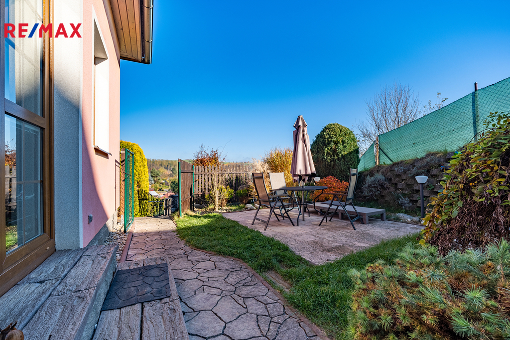 Dům stojí na pozemku o velikosti 143 m², ke kterému náleží ještě zahrada o výměře 562 m². Zahrada je pečlivě udržovaná, obklopená vzrostlou zelení a nabízí dostatek soukromí i prostoru pro relaxaci. Součástí je také terasa nad garáží s dechberoucím výhledem na okolní krajinu – ideální místo na letní posezení, grilování nebo odpočinek s kávou.
