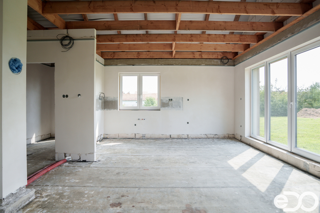 Dispozici tvoří vstupní chodba, prostorný obývací pokoj s přípravou na kuchyňský kout a krbová kamna, tři samostatné pokoje, koupelna, samostatné WC a technická místnost. Z obývací části je vstup ven, kde si můžete vybudovat příjemné posezení nebo terasu.