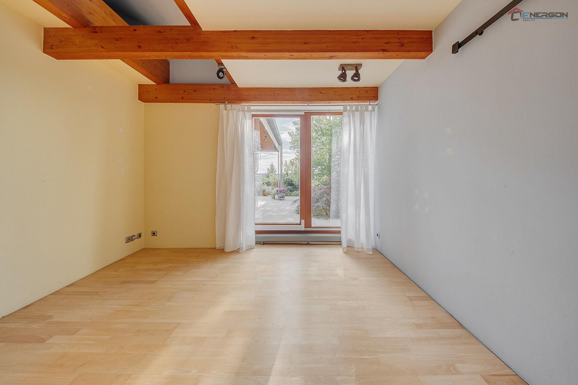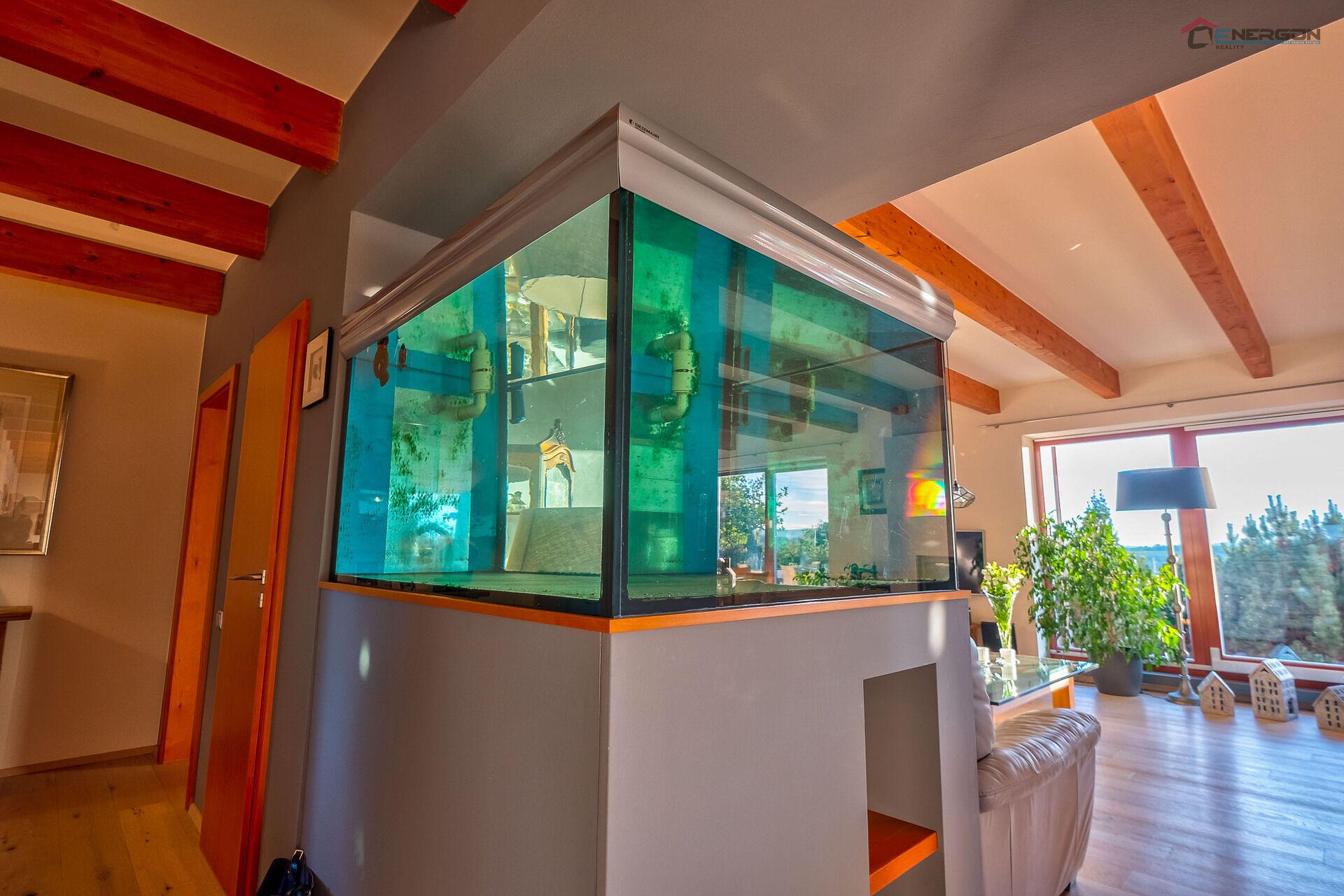 Srdcem domu je veliký obývací pokoj spojený s jídelním a kuchyňským koutem. Dostatek světla zajišťují velkoformátová okna směřující na jihozápad, poskytují uklidňující pohled do překrásné zahrady i ničím nerušený výhled v úhlu 180 ° na brdské lesy. Pocit prostoru a vzdušnosti dodávají také některé prosklené dveře. Součástí obývacího pokoje je velké akvárium.