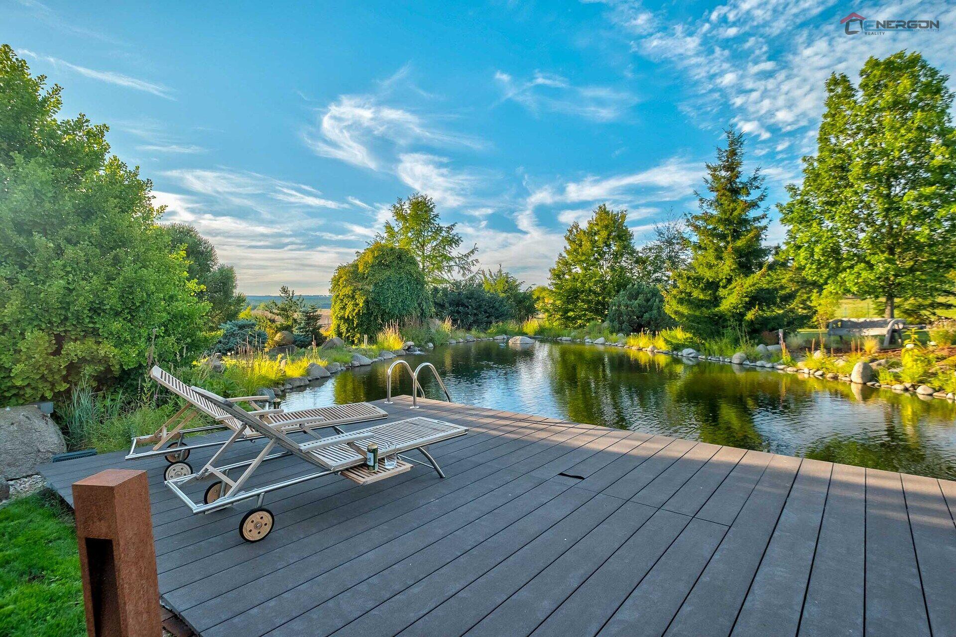 • tří jezírka propojená potokem, největší z nich je koupací s velkým dřevěným molem