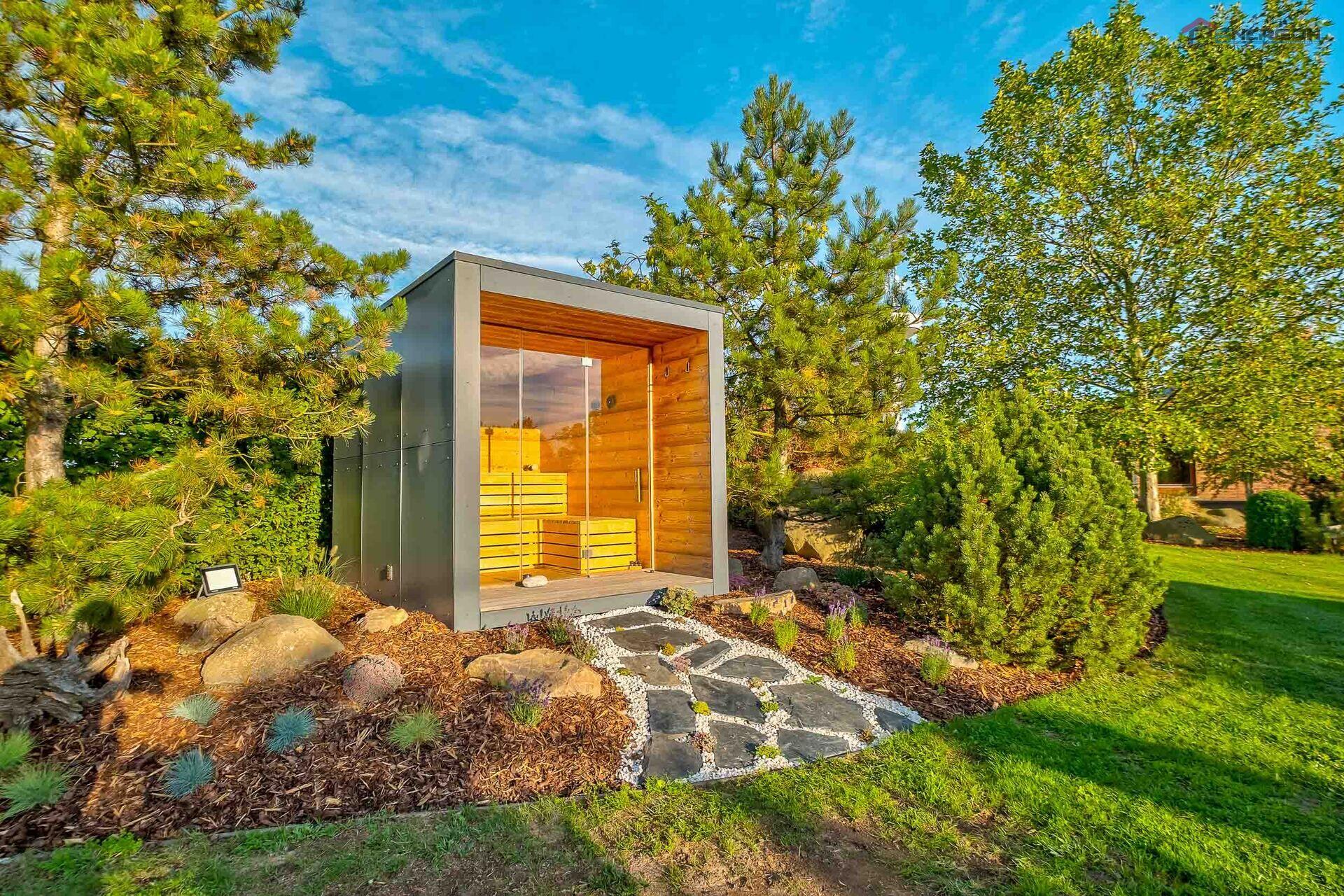 • moderní venkovní sauna citlivě zasazená v zeleni