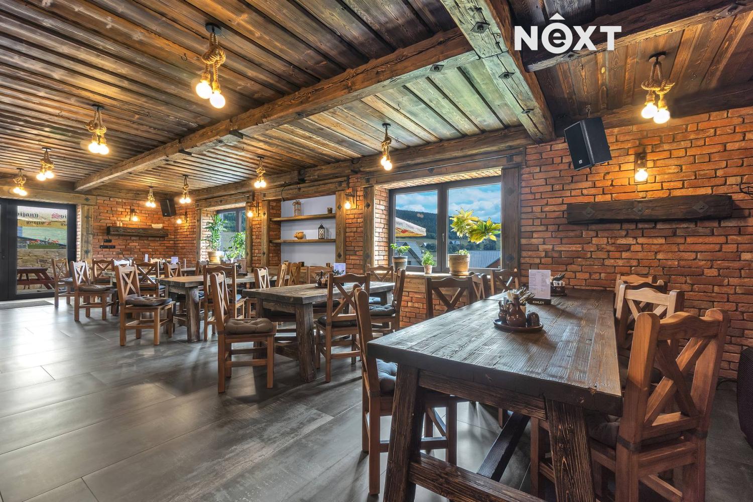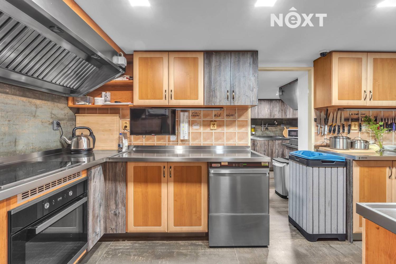 V suterénu se pak nachází sklepní bar, WC, snídaňový bar, společenská místnost s jídelnou pro ubytované hosty s krbem, který má svůj výměník a ohřívá vodu do akumulační nádrže na vytápění domu. Dále jsou v suterénu dvě kompletně vybavené kuchyně pro přípravu teplých a studených pokrmů, sklady potravin a nápojů, mrazáky a lednice, myčky na nádobí, sporáky a trouby.