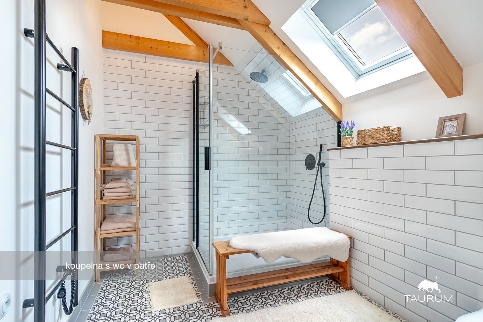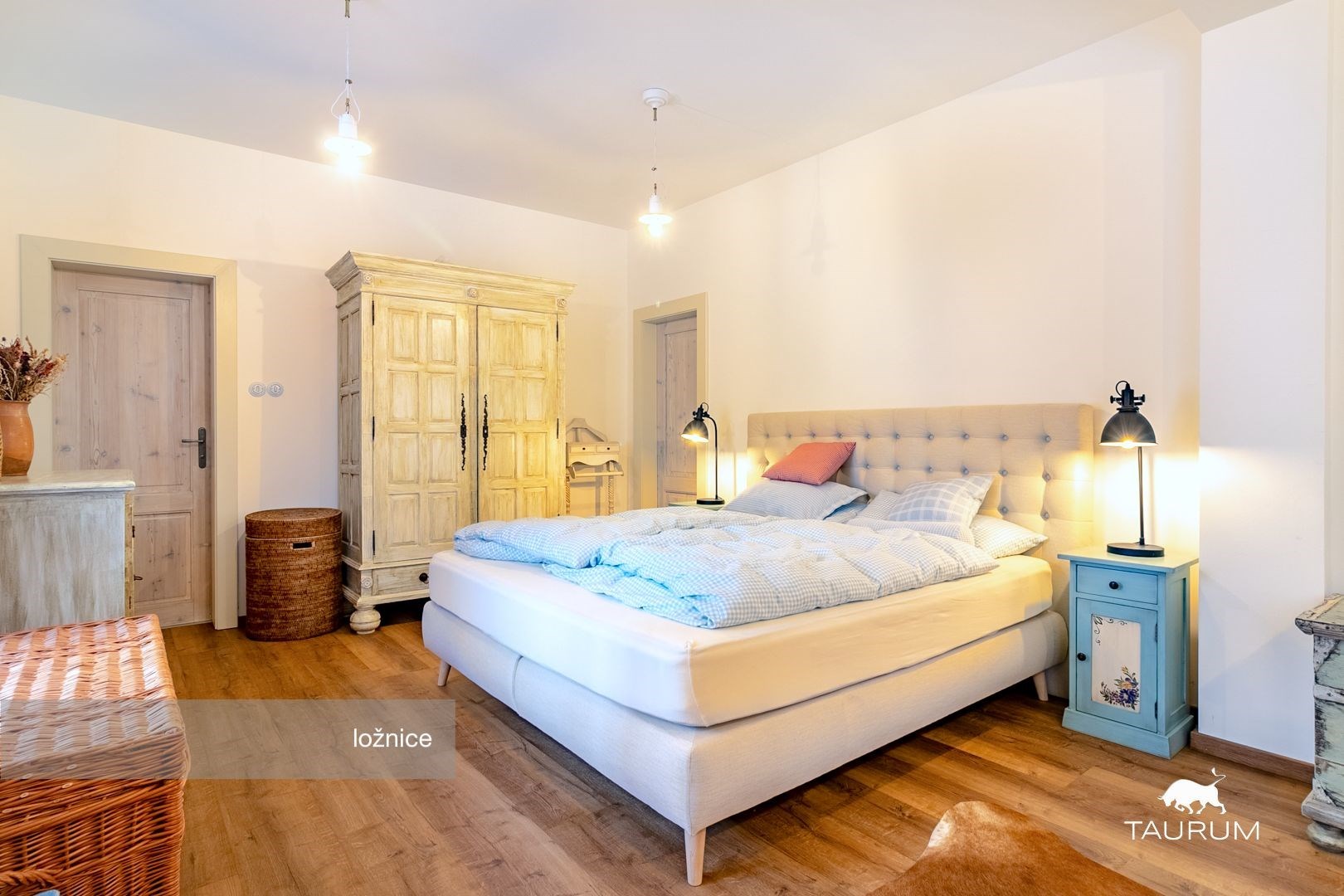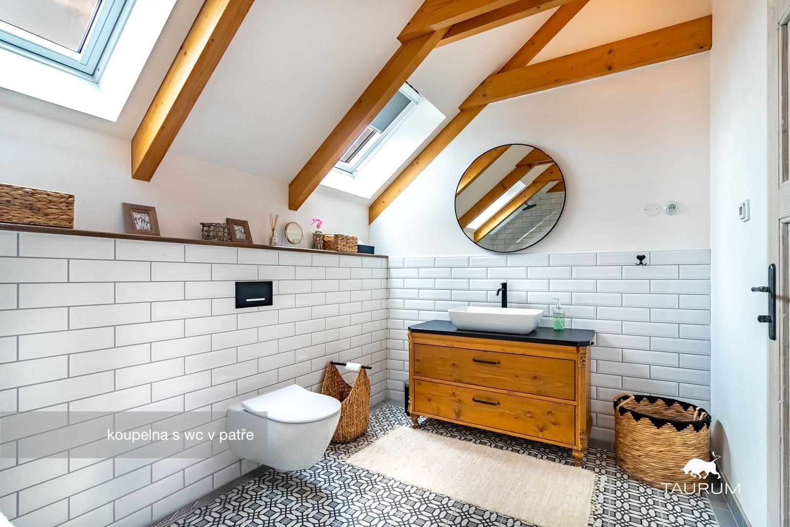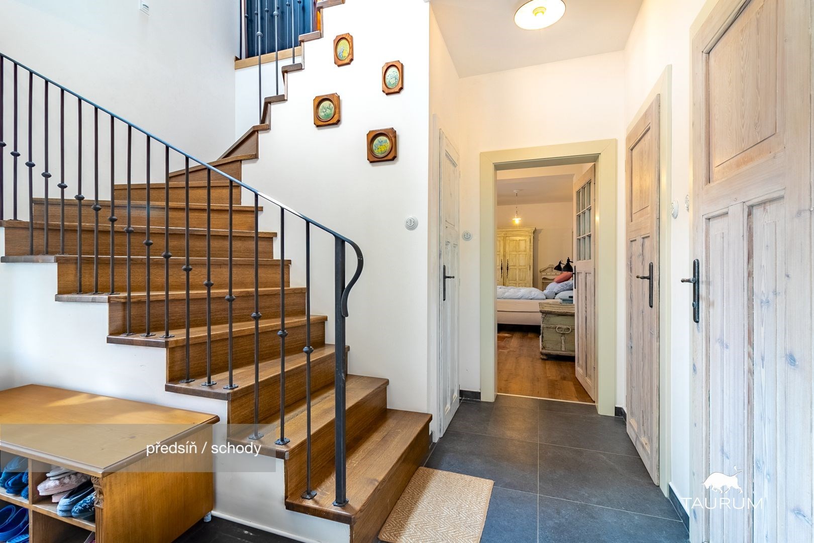 V patře jsou tři ložnice, obývací prostor a koupelna s toaletou.