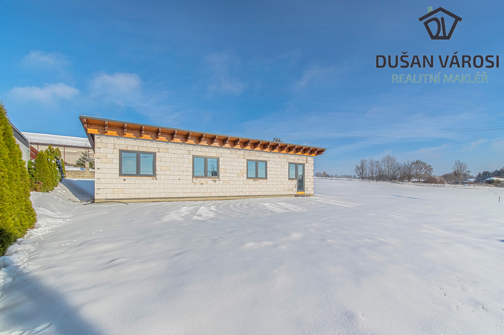 Dům je jednopodlažní s plochou střechou krytou falcovaným plechem což jí zajišťuje dlouhou životnost. Oplechovaný je i komín. Trámy střechy i garáže mají finální hoblovanou úpravu, po zateplení domu s nimi není již třeba nic provádět. Stavba stojí na betonové desce a není podsklepená. Obvodové zdivo tvoří tvárnice Porfix tl 250 mm. Výplně oken jsou trojskla. Komín je připravený na osazení kotle na tuhá paliva, přičemž se počítalo s podlahovým vytápěním s okruhem teplé vody. Nicméně je možné využít i tepelné čerpadlo.