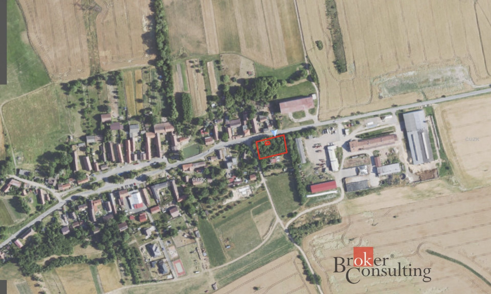 Pozemek obdélníkového tvaru je situován u hlavní asfaltové komunikace na začátku obce ze směru od Rakovníka, který je vzdálen 13 min jízdy autem.