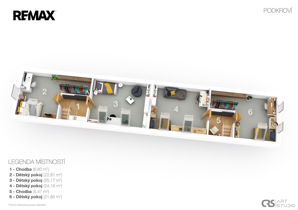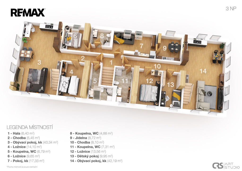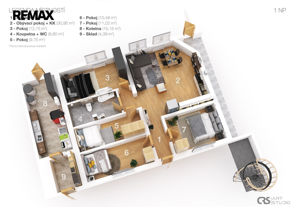 apartmán č. 1 5+1, 93 m², apartmán č. 2 2+kk, 35 m², apartmán č. 3 2+kk, 36 m², apartmán č. 4 2+kk, 36 m², apartmán č. 5 3+1, 58 m². V podkroví je navíc připravena možnost vybudování ještě dalších dvou bytových jednotek 3+1 o celkové ploše 135 m².