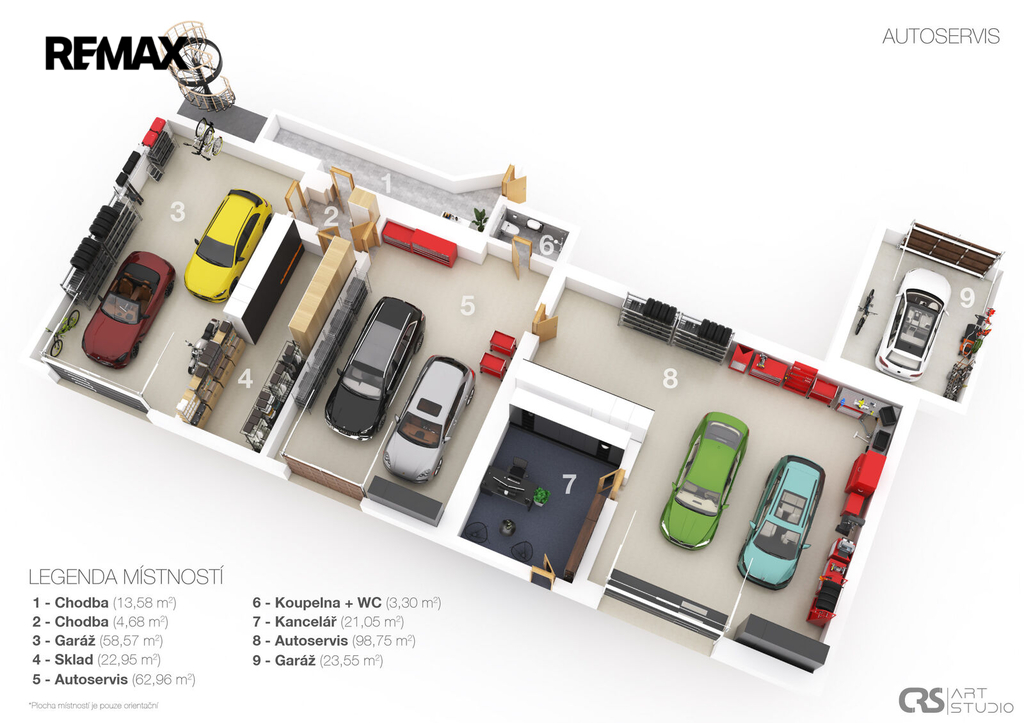 Samostatná zděná budova autoservisu a pneuservisu o užitné ploše 266 m² nabízí dílny, sklady, garážové i provozní zázemí. Před budovami jsou k dispozici parkovací plochy, celkem cca 15 parkovacích míst.