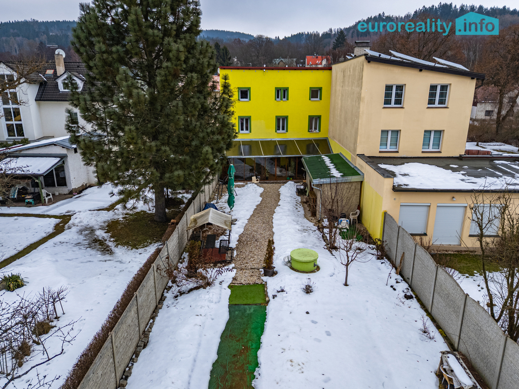 Dům o užitné ploše 200 m² se nachází na pozemku o rozloze 538 m² a má 3 nadzemní a 1 podzemní podlaží. Objekt lze využít jako zavedený penzion, prostorný rodinný dům nebo kombinaci bydlení a podnikání.