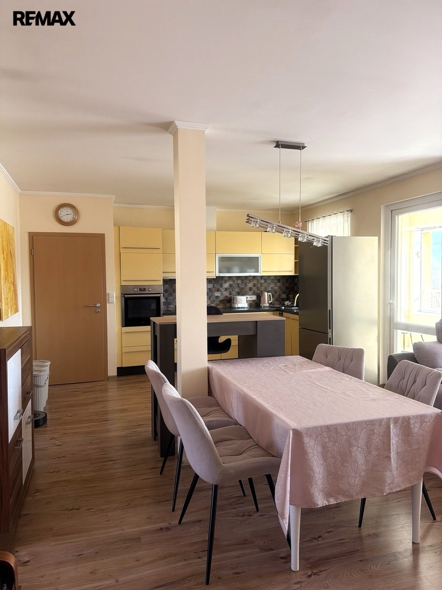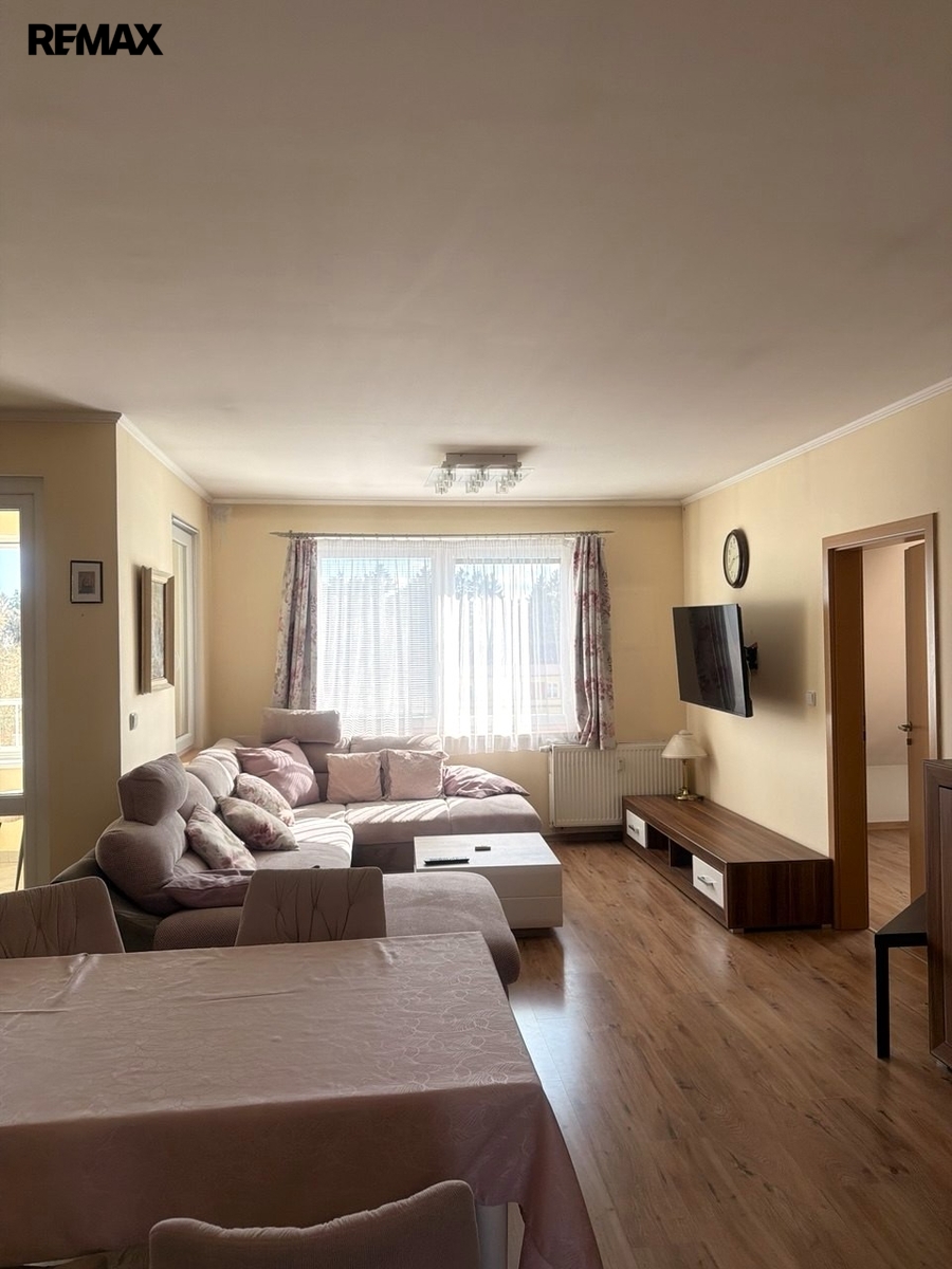 Byt disponuje prostorným obývacím pokojem s plně vybavenou kuchyní, třemi ložnicemi, dvěma toaletami a koupelnou s velkou vanou. Příjemným bonusem je prostorný balkon s krásným výhledem, který nabízí útulné posezení ideální pro ranní kávu.