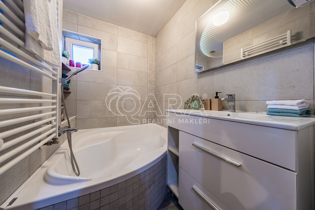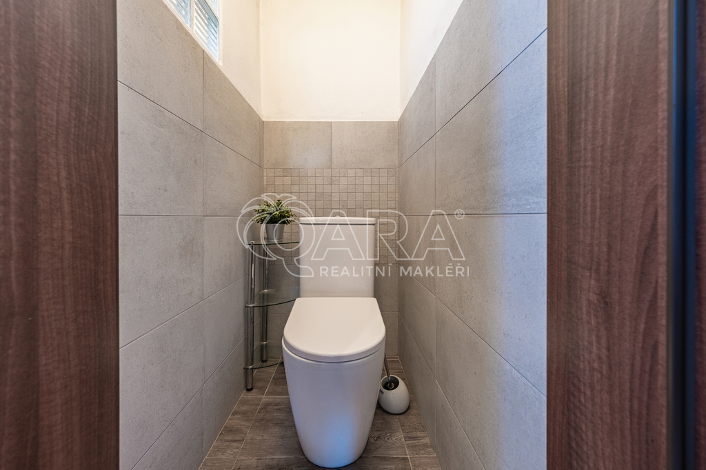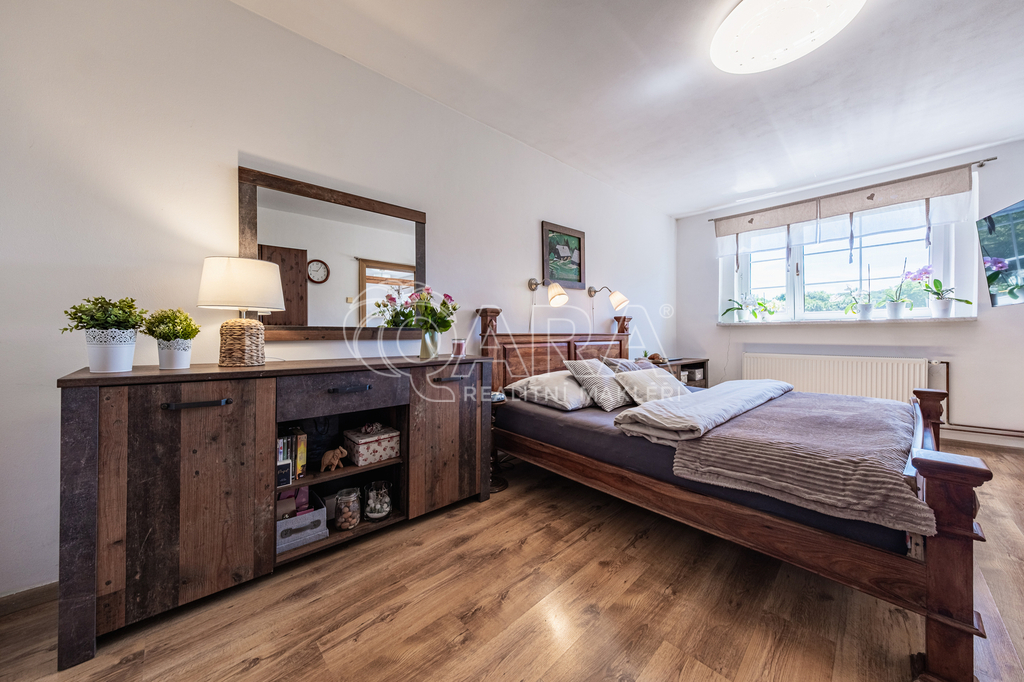 Do domu se vchází bývalým průjezdem, ze kterého je nyní uděláno prostorné garážové stání, takže pěkně suchou nožkou z domu do auta. Vjezd je opatřen novými elektrickými garážovými vraty se samostatným vstupem "pro pěší". Je zde umístěný Wallbox - nabíjecí stanice pro dvě elektroauta. Z průjezdu se vchází do přízemí domu nebo rovnou na zahradu. V přízemí je situován samostatný byt 1+kk, který je možno využít jako kancelář či máte-li odrostlejšího potomka a chce se cítit tak trochu samostatně, i zde je tato možnost, nebo pronájem. Byt je vybaven plně funkční kuchyňskou linkou, velkou a pohodlnou manželskou postelí s nočními stolky, komodou a TV, jídelním stolem a velkorysou šatní skříní na míru, prostornou koupelnou se sprchovým koutem a toaletou.