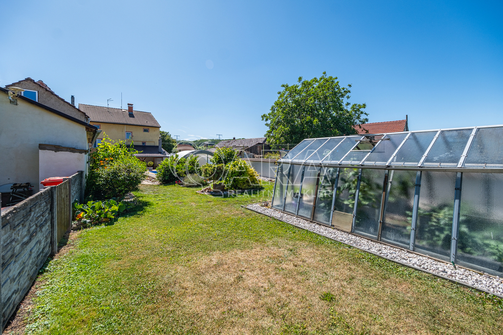 Z nejvyššího patro se sneseme opět do přízemí přímo na udržovanou zahradu se skleníkem, se zastřešeným bazénem se slanou vodou, bazén není vyhřívaný, ale i tak je možno se koupat i v podzimních slunečních dnech. Venkovní posezení si můžete vychutnat pod zastřešenou pergolou s krbem. Stodola na druhém konci zahrady nabízí další prostor pro dílnu či garáž. Technické zázemí a malý sklad s dílnou se nachází v samostatných místnostech hned vedle domu.