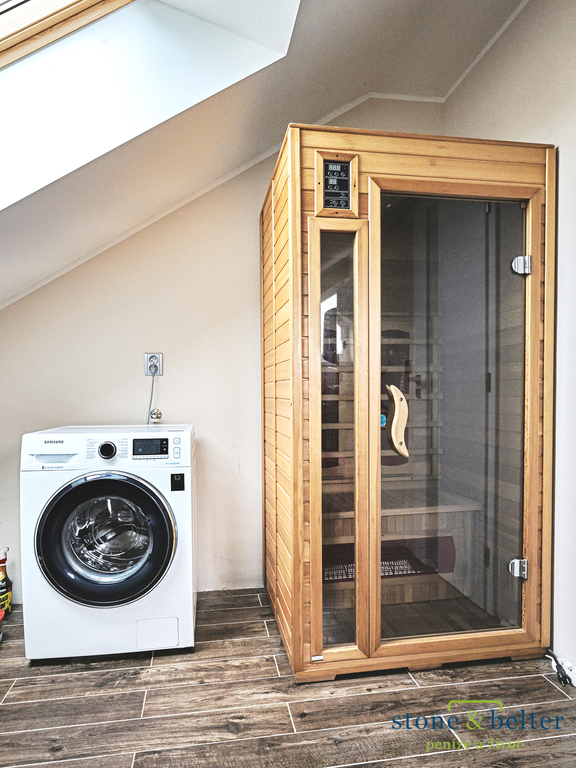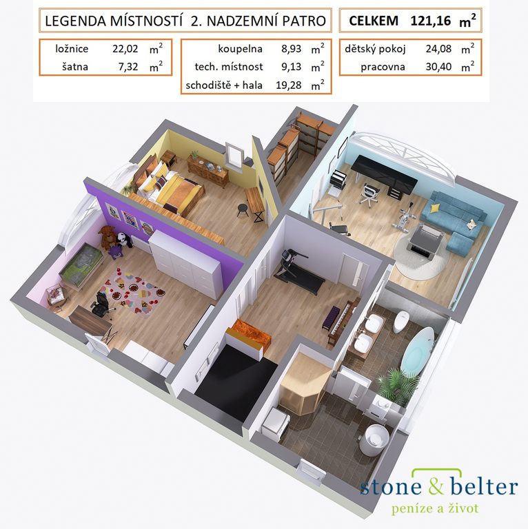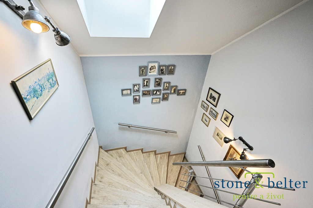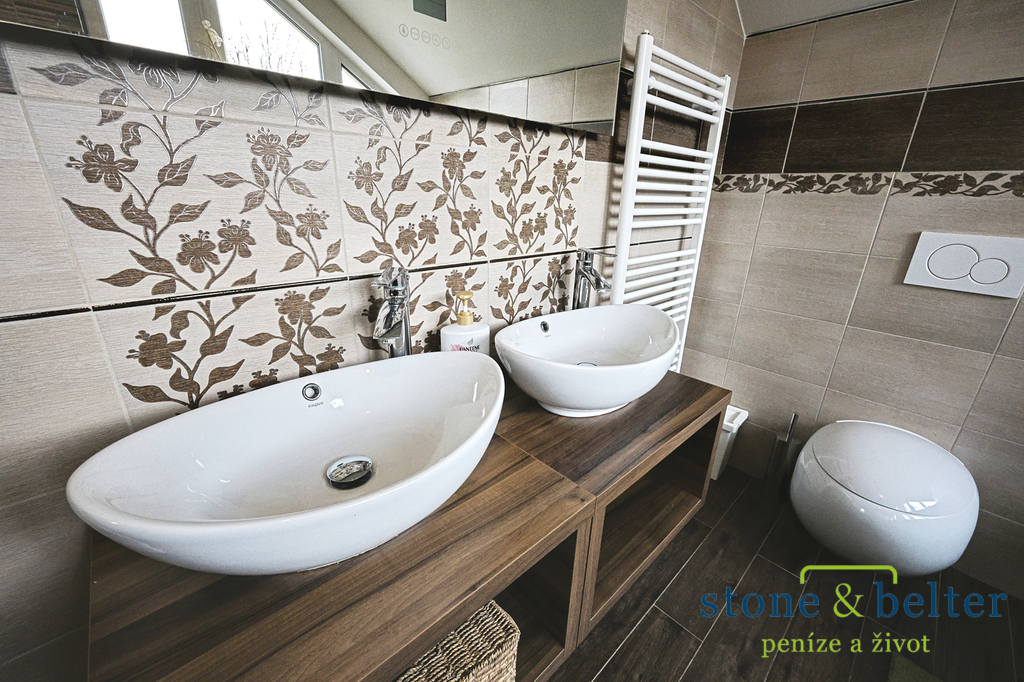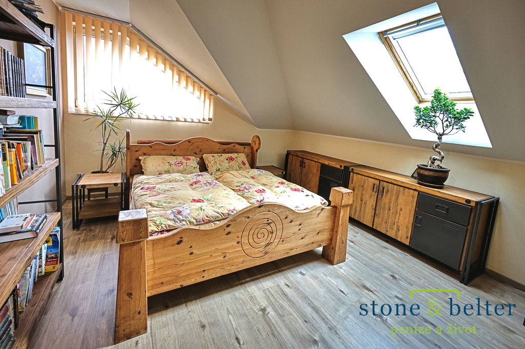 Po schodišti se vystoupá do druhého podlaží, kde jsou tři neprůchozí pokoje – ložnice s navazující samostatnou šatnou, dětský pokoj a pracovna. Dále je zde prostorná a světlá koupelna s vanou a WC. V horním patře se je druhá technická místnost s kotlem, bojlerem, automatickou pračkou a pro chvíle odpočinku i infrakabinou.