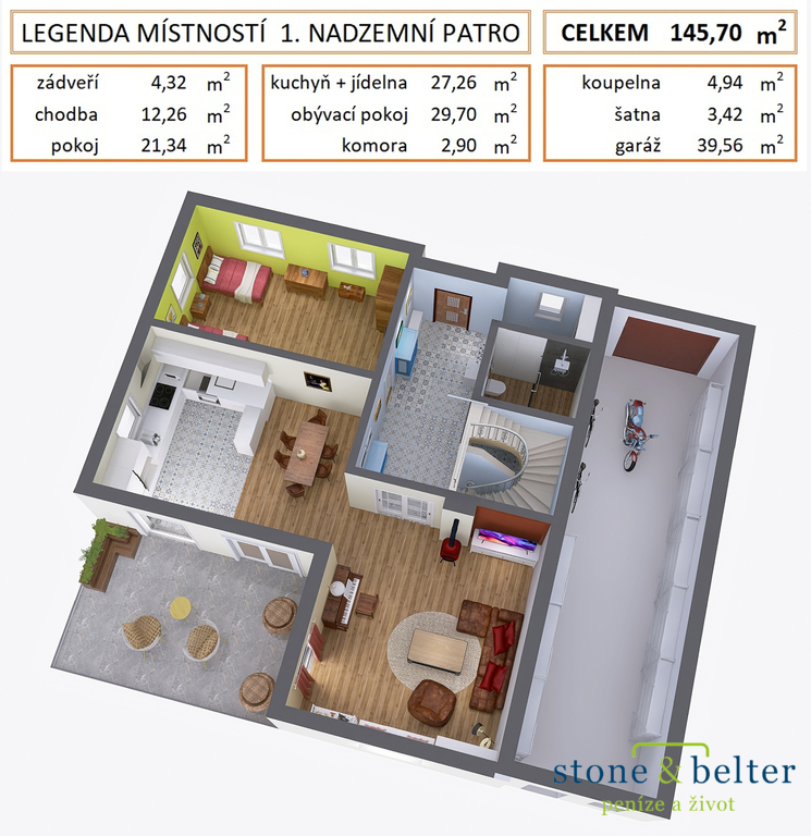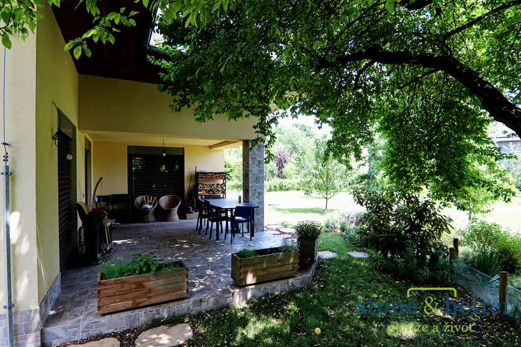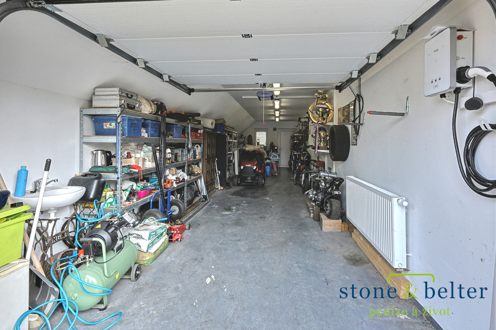 Průchozí garáž nabízí dostatečný prostor pro dvě osobní auta, sportovní vybavení (motocykl, kola) a praktickou dílnu. Přirozeným propojením domu se zahradou je velká zastřešená terasa, ideální pro rodinné posezení či odpočinek.