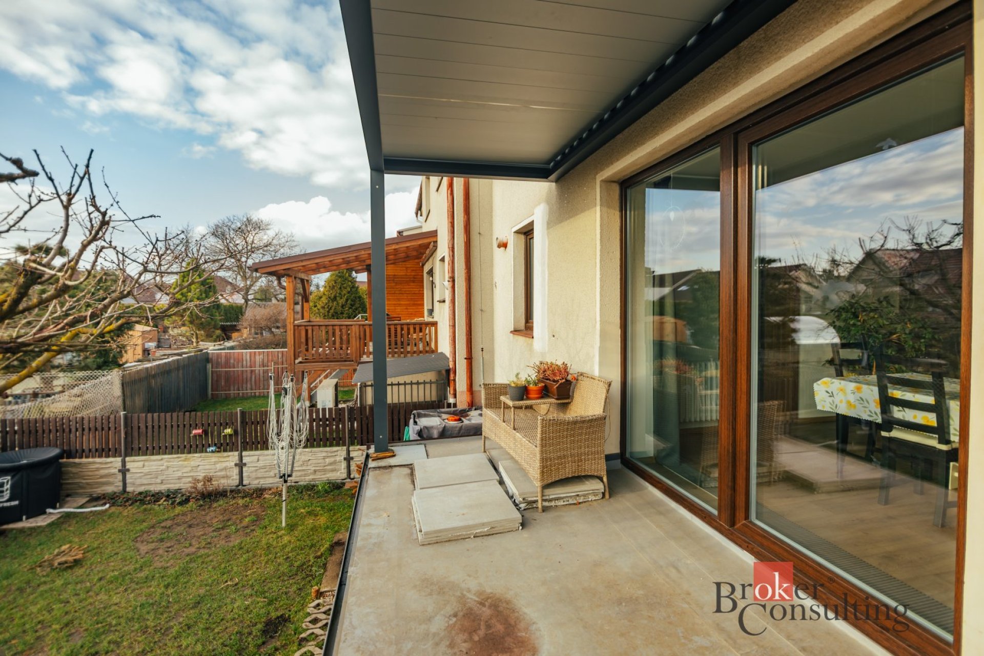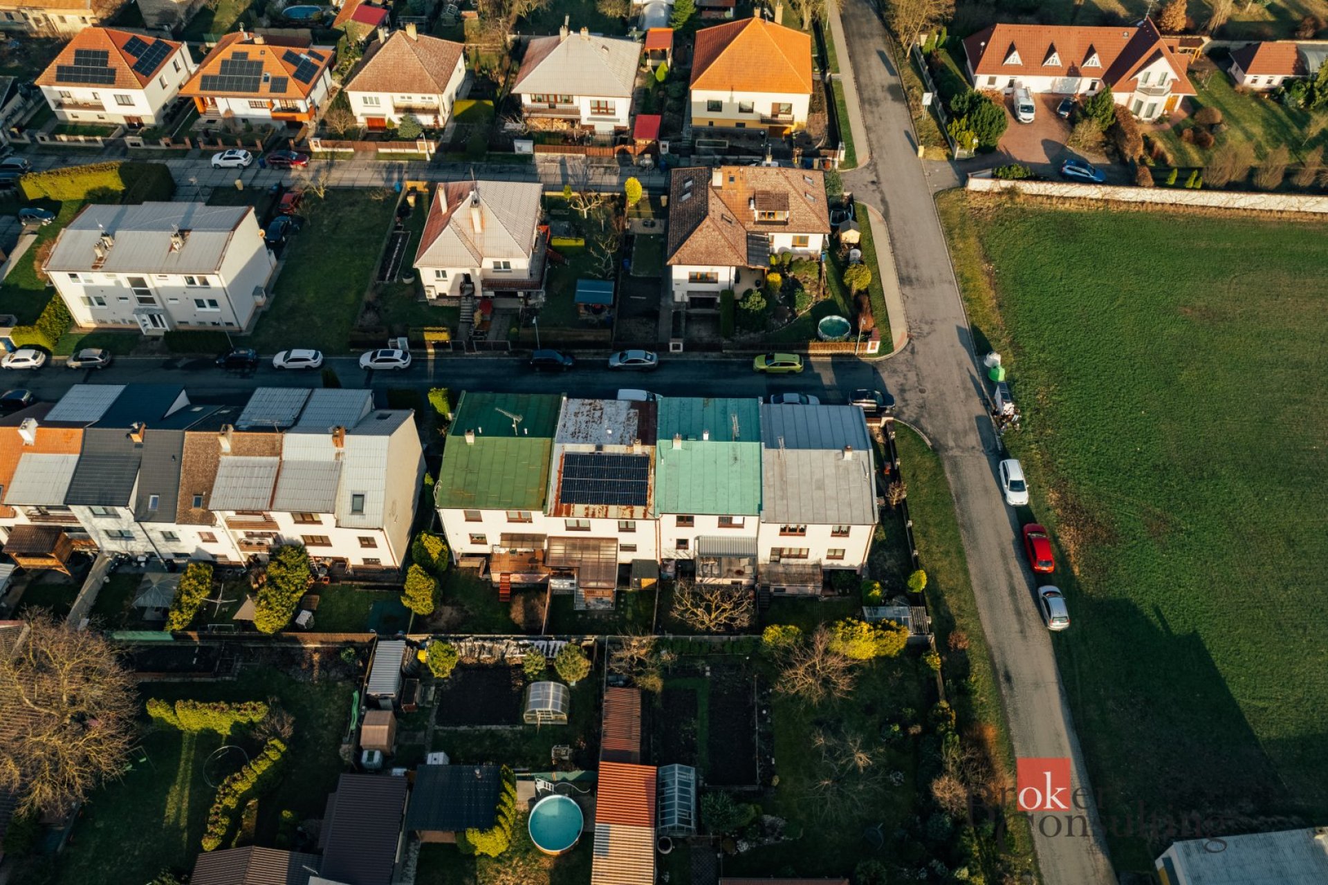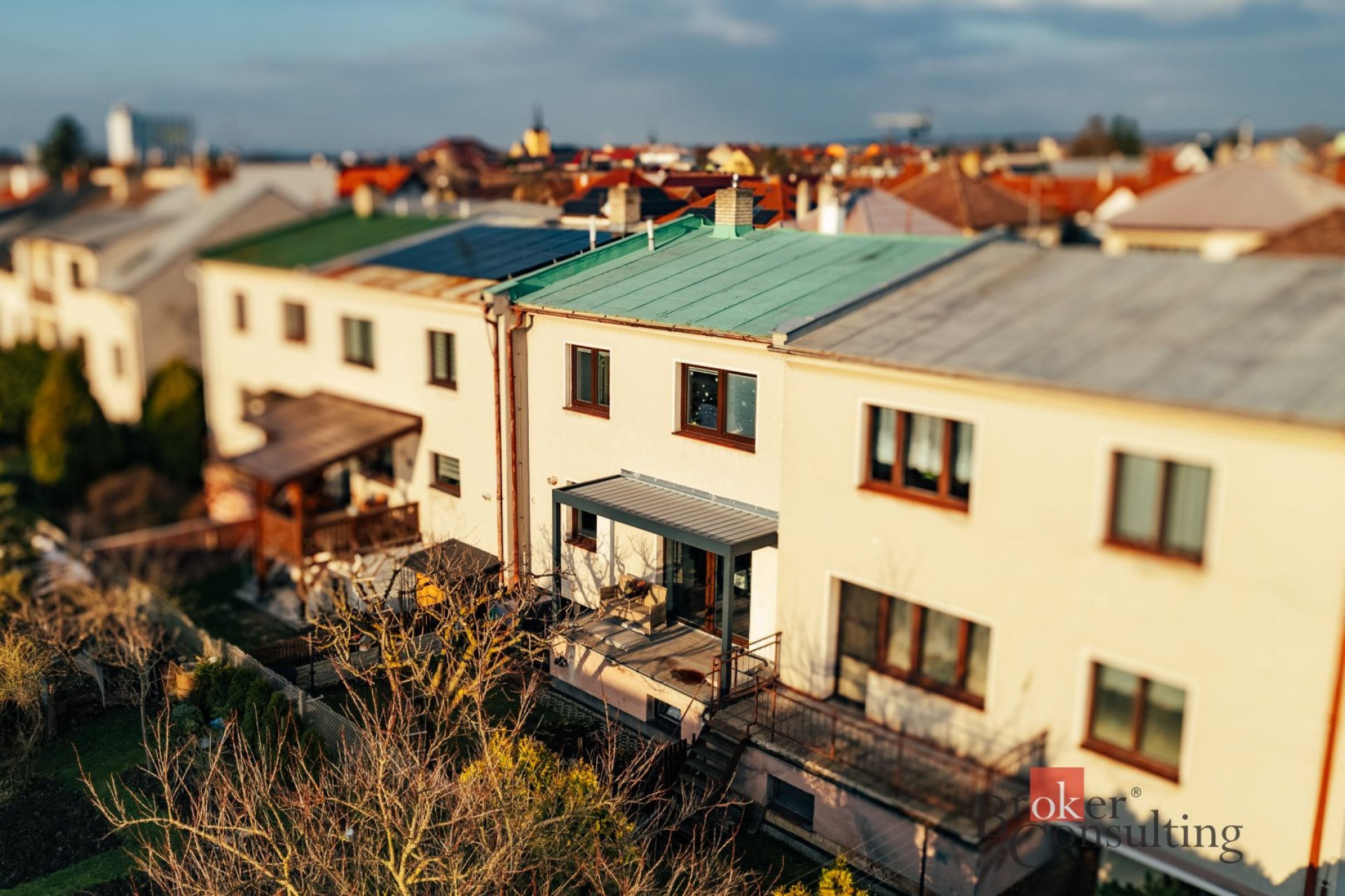 Dispozice domu: Zvýšené přízemí nabízí vstupní chodbu, prostorný obývací pokoj s jídelnou se vstupem na zahradu, moderní kuchyni a samostatnou toaletu. V patře se nachází ložnice, dětský pokoj, další obytná místnost vhodná např. jako pracovna, koupelna s vanou i sprchovým koutem. Z obou stran domu jsou balkony.