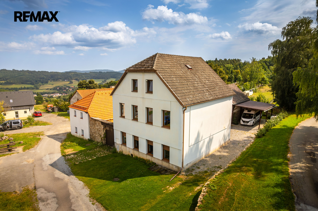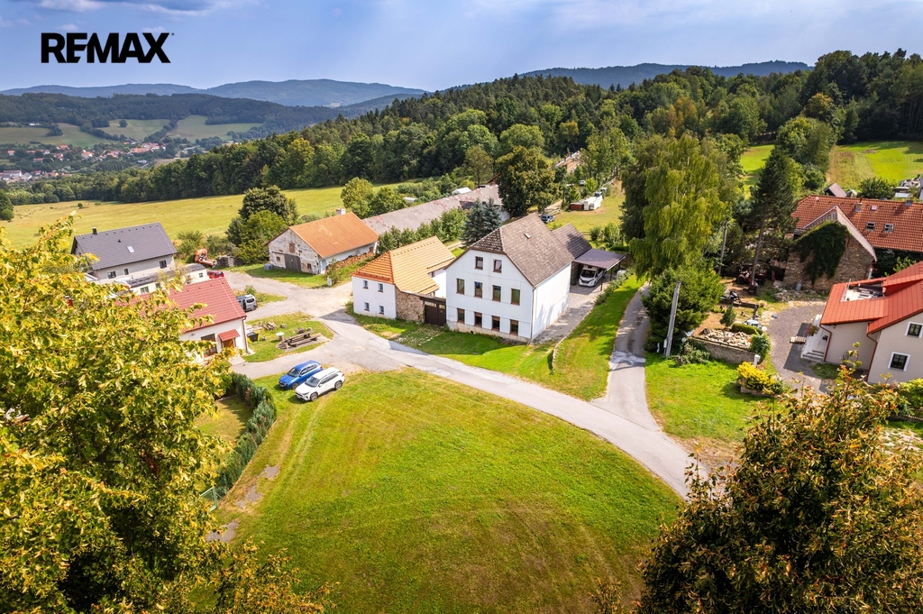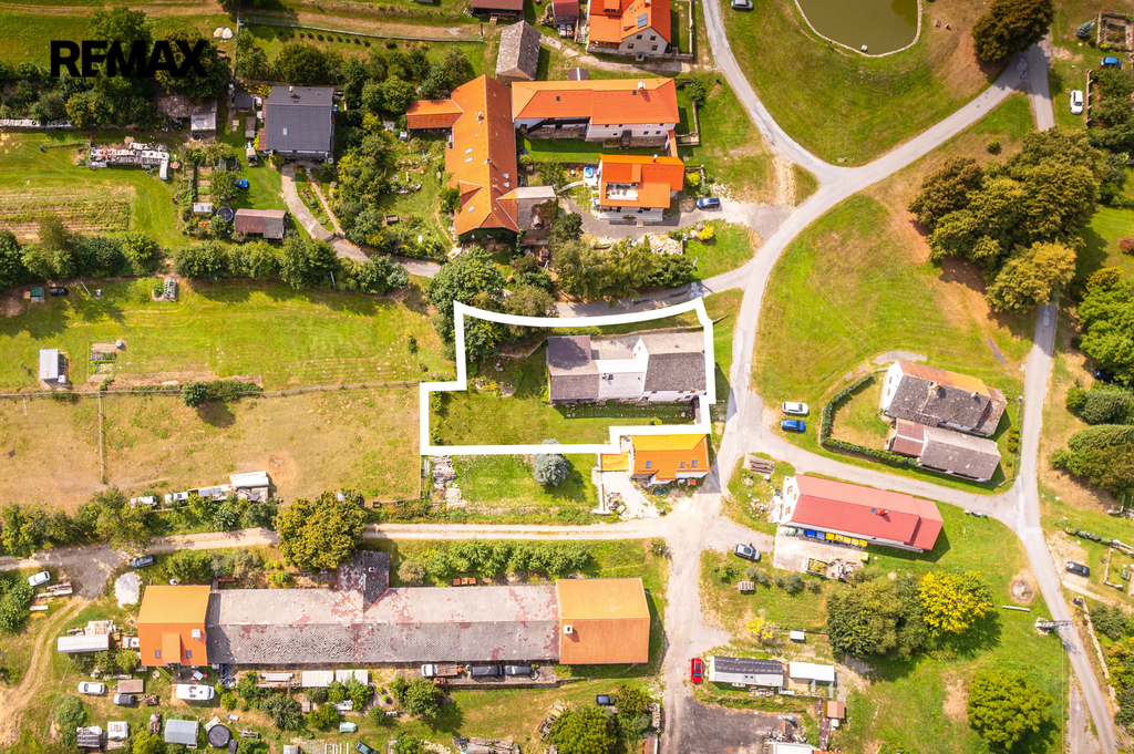 Prodávaná nemovitost se nachází na rohu návsi na opačné straně, než je příjezd do vsi. Tvoří ji velká stavba s navazující zahradou a přilehlým pozemkem, celková velikost pozemku činí 1.112 m2.