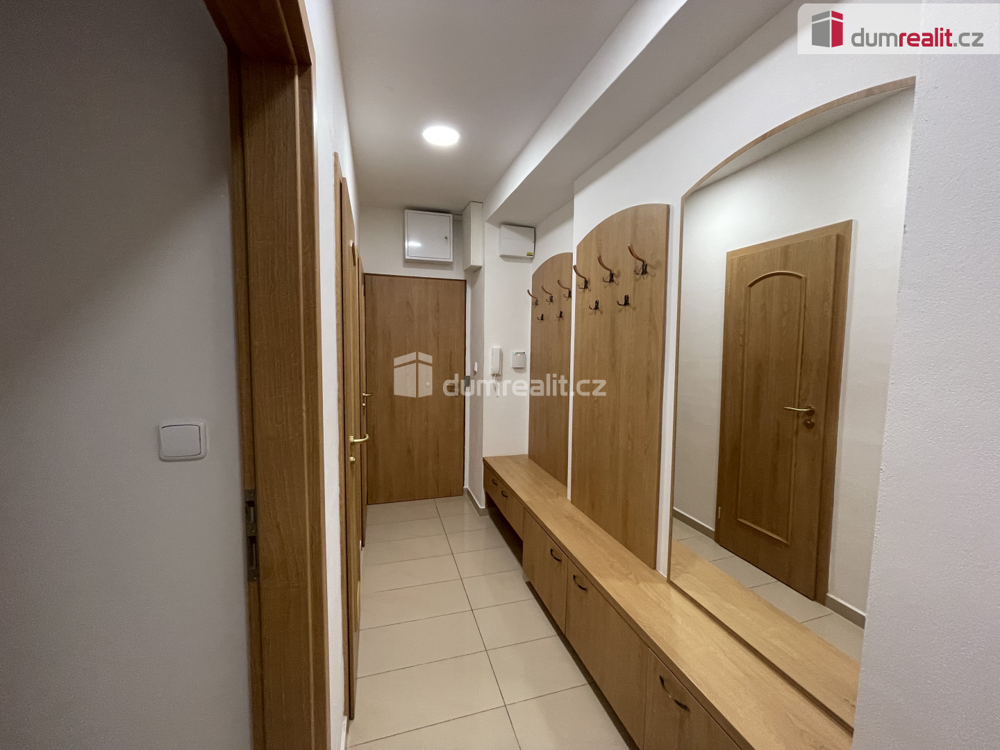 Obývací pokoj s TV a skříněmi, ložnice se skříněmi, vstupní chodba s předsíňovou stěnou.