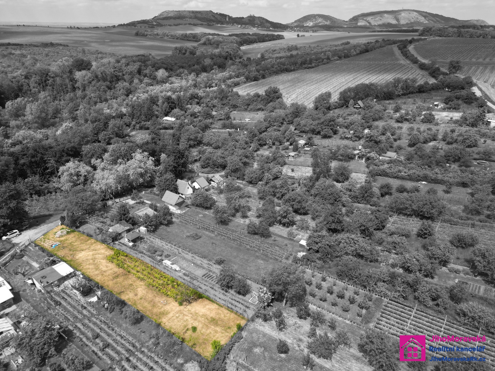 Z pozemku jsou krásné výhledy na Stolovou horu a Pálavu.