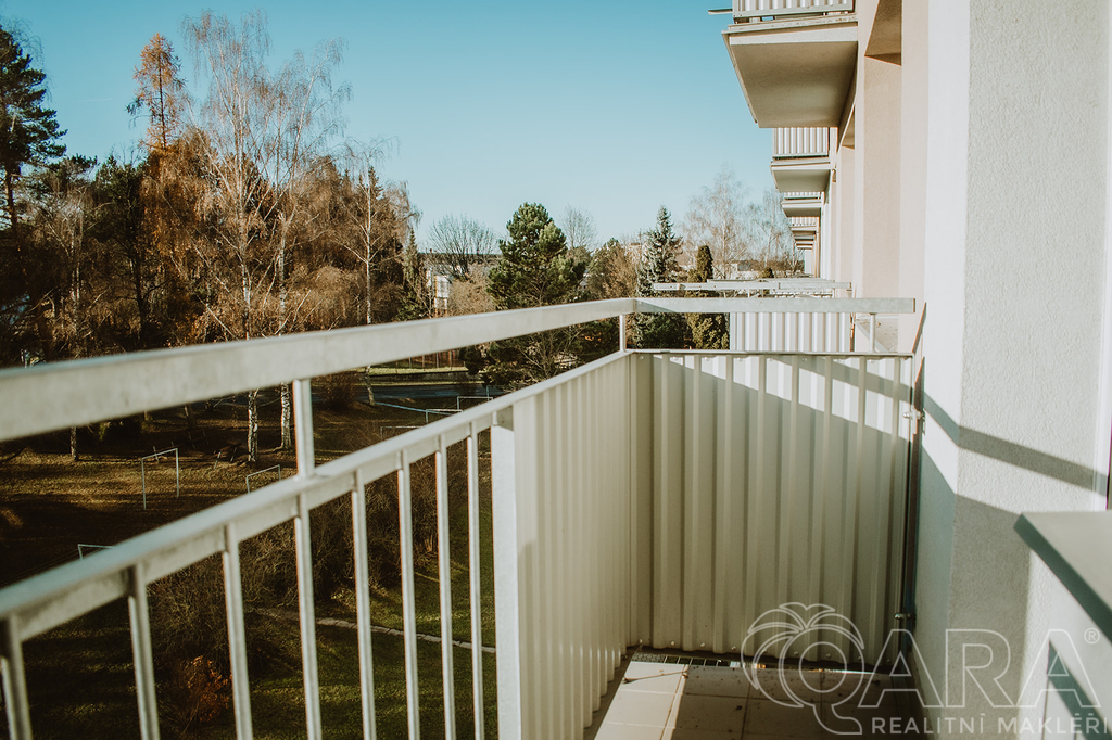 Dispozice bytu zahrnuje průchozí kuchyni, ložnici, a koupelnu se sprchovým koutem, chodbu a wc. K bytu náleží balkon o ploše 3 m². Objekt disponuje výtahem a nabízí pohodlný přístup do vyšších podlaží.