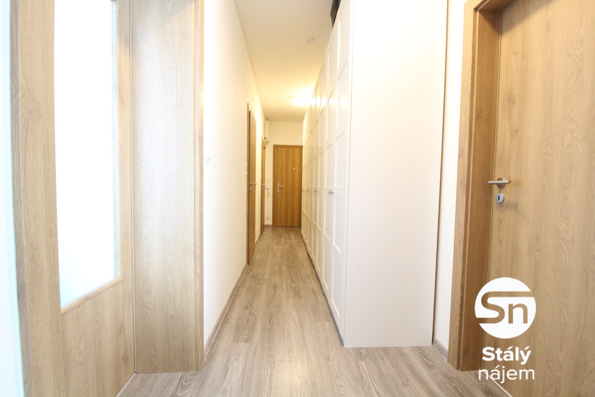 Byt sestává ze dvou samostatných pokojů a velkého obývacího pokoje s moderní kuchyňskou linkou. Kuchyň je vybavena elektrickou troubou, varnou deskou, mikrovlnnou troubou, lednicí s mrazákem, myčkou a digestoří. Z obývacího pokoje je vstup na balkon, který poskytuje příjemný prostor k relaxaci. Obě ložnice jsou nezařízené, což umožňuje jejich vybavení podle vlastních představ. Jeden z pokojů má vlastní přístup na druhý balkon. Koupelna je vybavena vanou, v komoře je umístěna pračka a police pro ukládání věcí. Chodba disponuje vestavěnými skříněmi, které poskytují dostatek úložného prostoru.