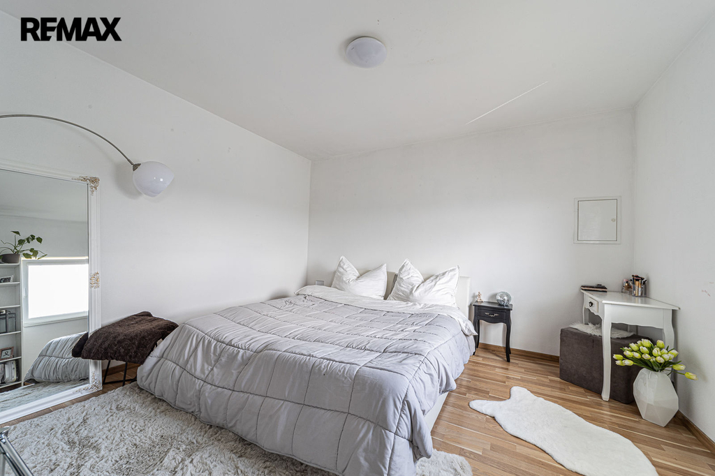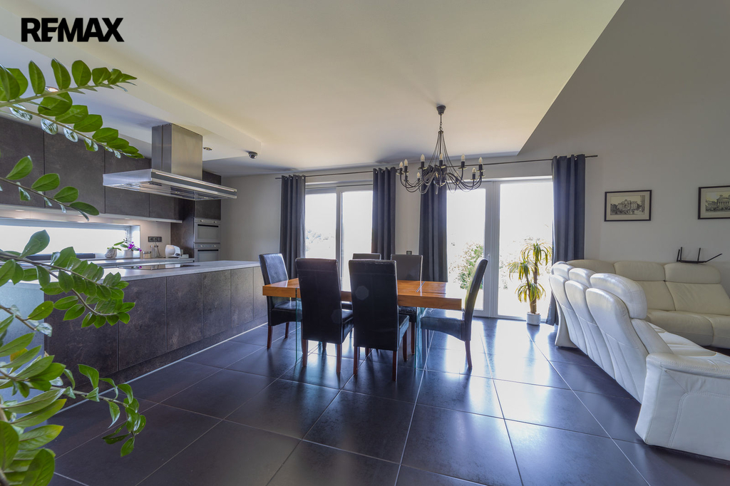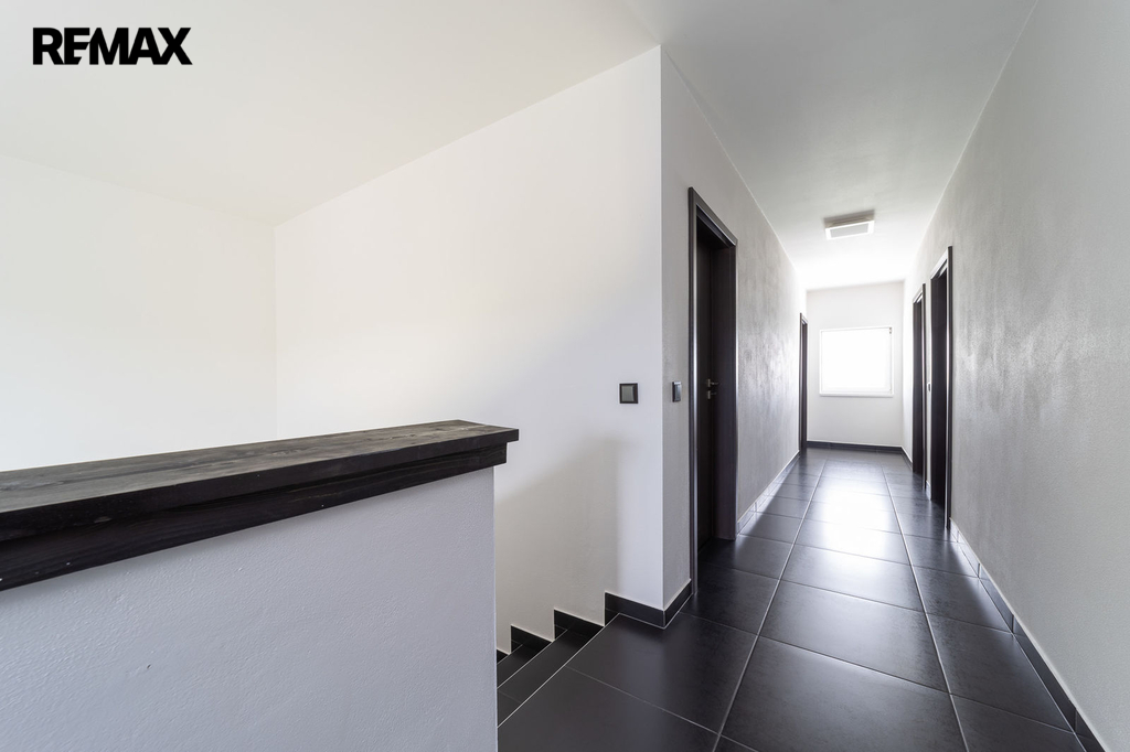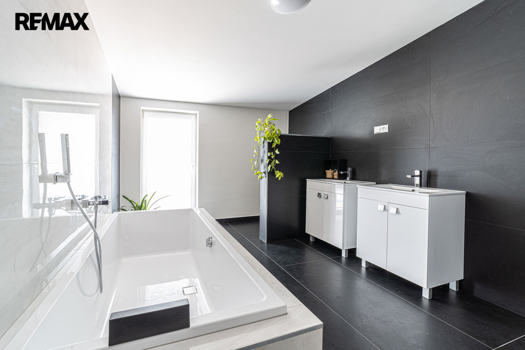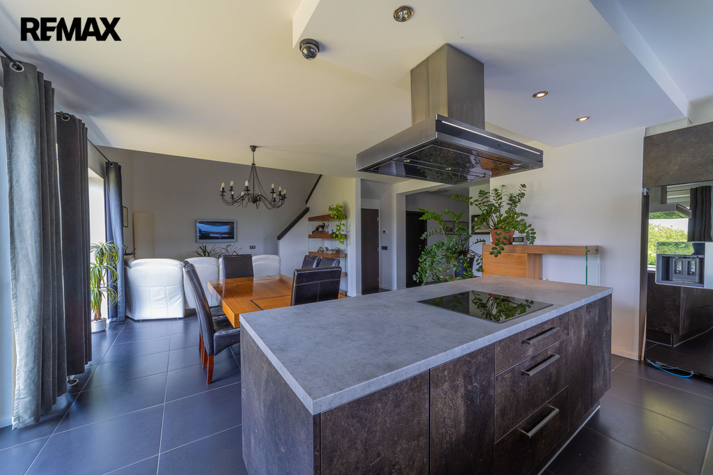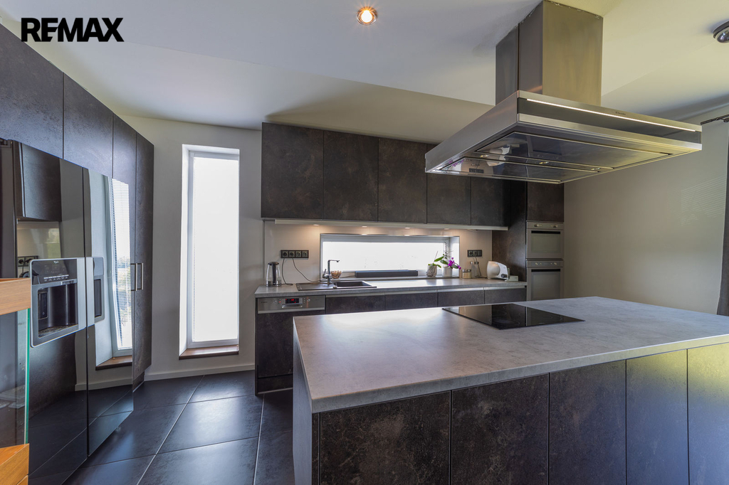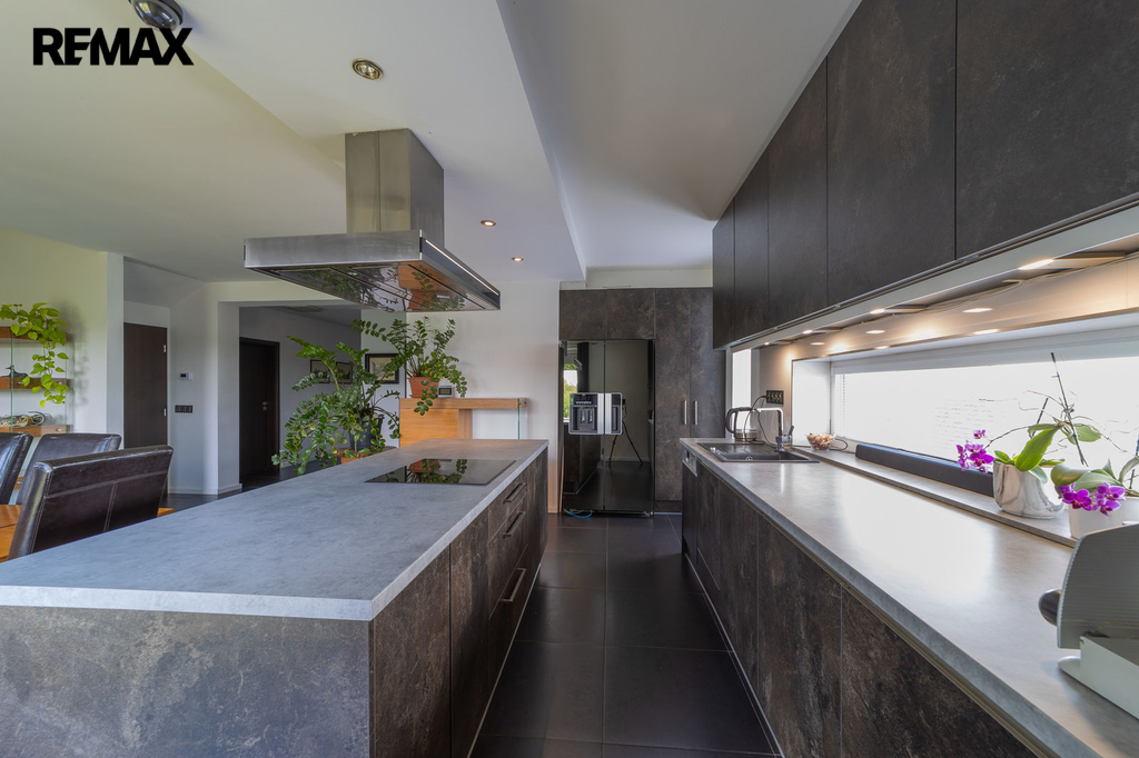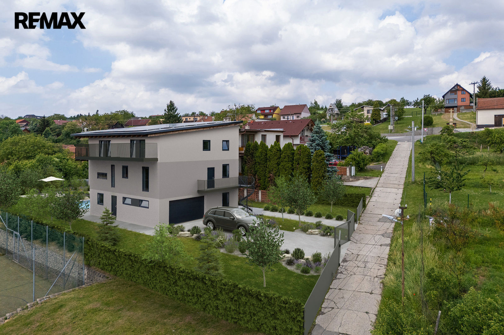 V přízemí domu je samostatná bytová jednotka 1kk včetně koupelny a samostatného wc. Dále je zde prostorná dvougaráž, dílna, sklad na sportovní potřeby a technická místnost, ve které se mimo jiné nachází řídící jednotka fotovoltaické elektrárny umístěné na střeše domu s výkonem 20 kw. Ve druhém a třetím podlaží se nachází opravdu nadstandardně řešený byt 7kk. Při vstupu do tohoto bytu máme hned v prostoru zádveří pracovnu a šatnu, dále se pak otvírá obrovský prostor, který propojuje kuchyň s varným ostrůvkem, jídelnu a obývací pokoj, který je otevřený do galerie do dalšího podlaží. Na tomto patře se dále nachází master bedroom s privátní koupelnou a také samostatná toaleta pro návštěvy. Po vzdušném a světlém schodišti vystoupáme do horního podlaží, kde se nachází soukromá zóna majitelů, kde máme k dispozici krom již zmíněné prostorné koupelny s vanou a sprchovým koutem také další šatnu a 4 pokoje. V tomto podlaží mají téměř všechny pokoje včetně koupelny přes francouzská okna přístup na balkóny, obepínající celou jihozápadní stranu domu.
