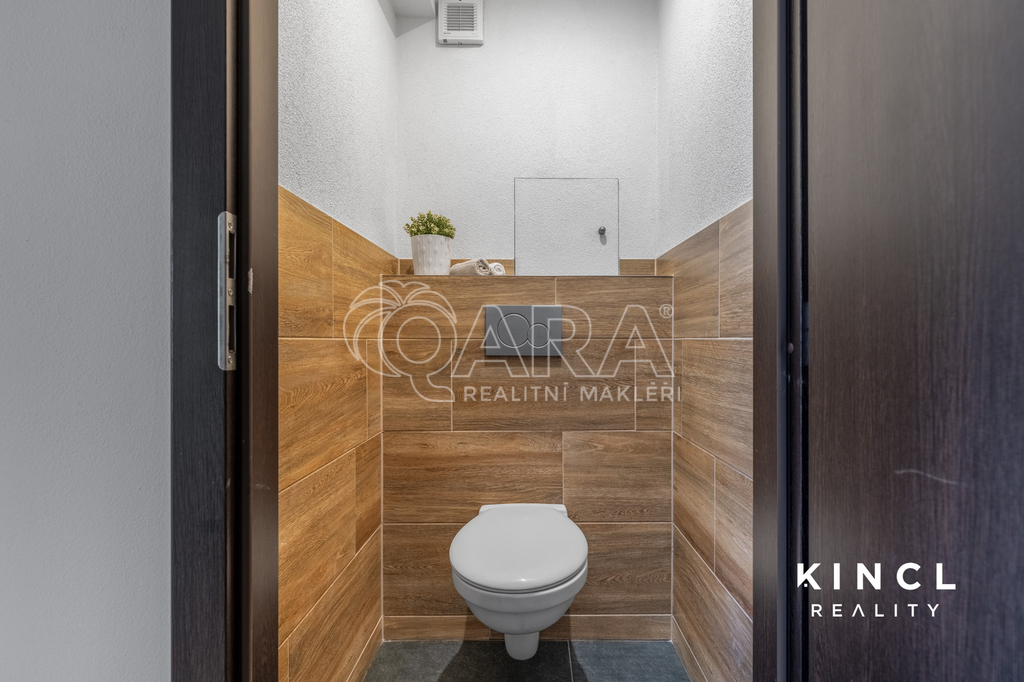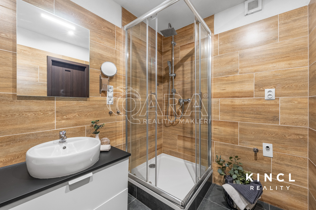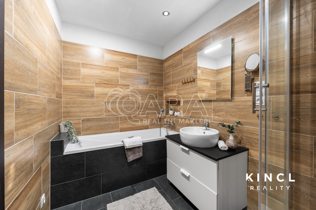 Kuchyňská linka je vyrobena na míru a osazena kvalitními spotřebiči Whirlpool – žádné provizorium, ale plnohodnotný a funkční prostor. Koupelna je prakticky zvětšená tak, aby se sem vešla vana i sprchový kout – ideální kombinace podle nálady a času.