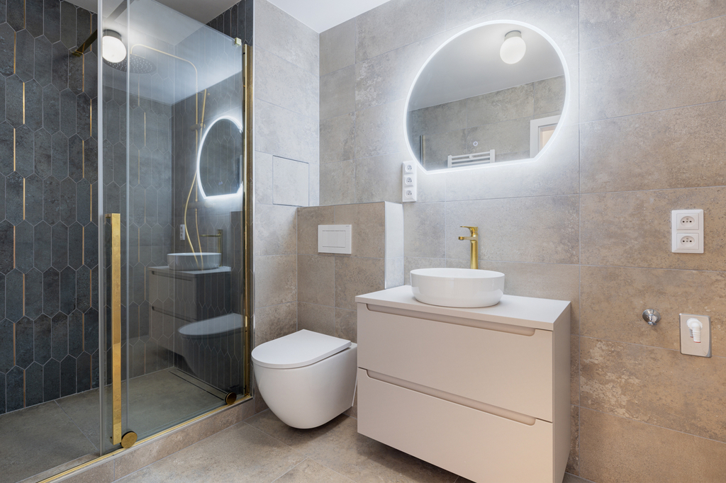 Koupelna byla navržena v moderním stylu s důrazem na detail. Dominantou prostoru je prostorný sprchový kout o rozměru 120 × 80 cm se skleněnými posuvnými dveřmi v elegantním kovovém rámu. Vnitřní část sprchy je obložena italskou mozaikou v odstínu emerald s metalickými prvky. Sprchový kout je doplněn kombinovanou sprchovou baterií s efektem vodopádu. Součástí koupelny je také designová umyvadlová skříňka s moderní baterií a zrcadlo s možností volby odstínu osvětlení.