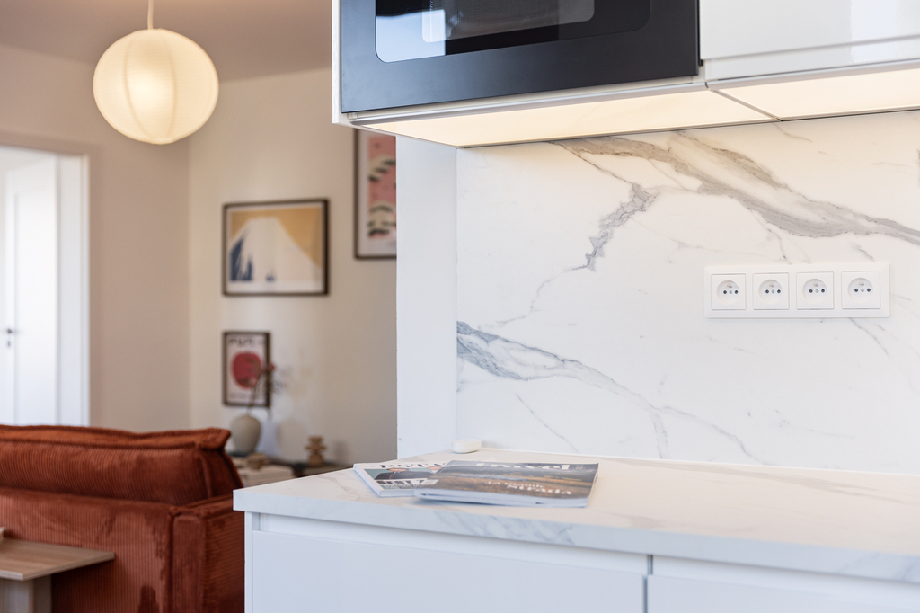 Kuchyňská linka IKEA kombinuje lesklá bílá dvířka VOXTORP s mramorovým dekorem pracovní desky a obkladu. Kuchyně je plně vybavena vestavnými spotřebiči: