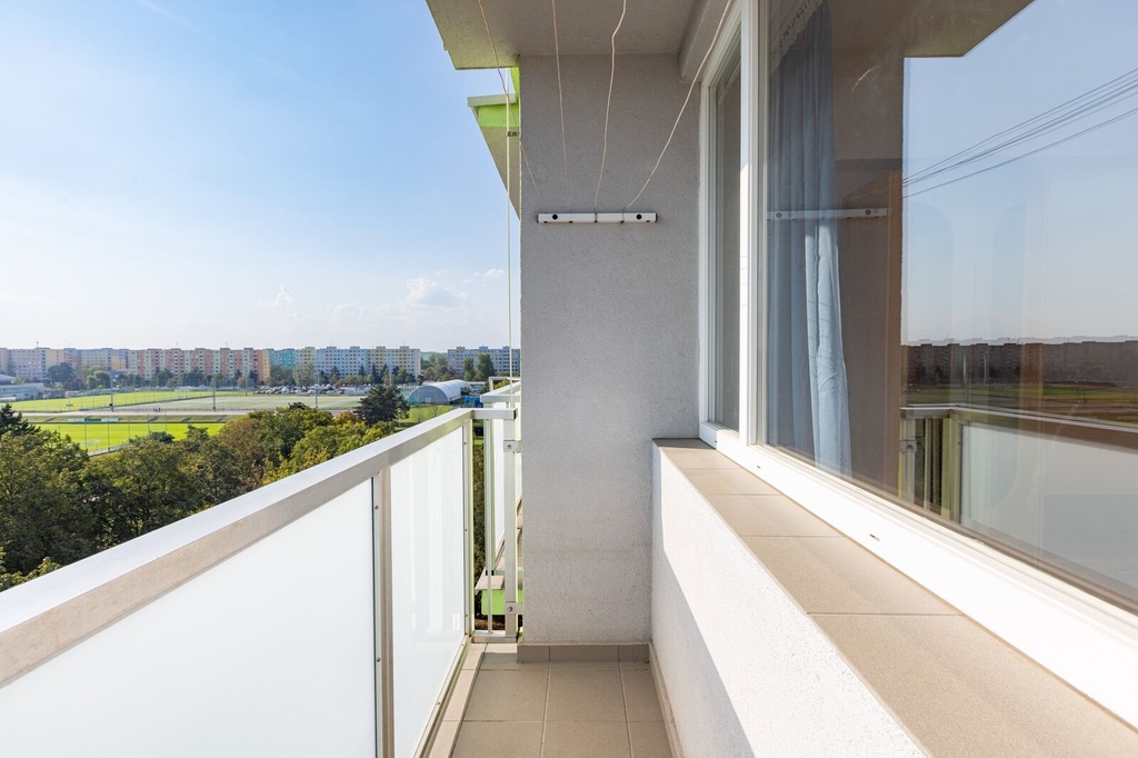 Plocha bytu je 41 m²+3m² balkón se skvělým výhledem na fotbalové hřiště. V obytných místnostech jsou plovoucí podlahy, v koupelně, toaletě a předsíni je dlažba. V koupelně je vana a toaleta je umístěna zvlášť.