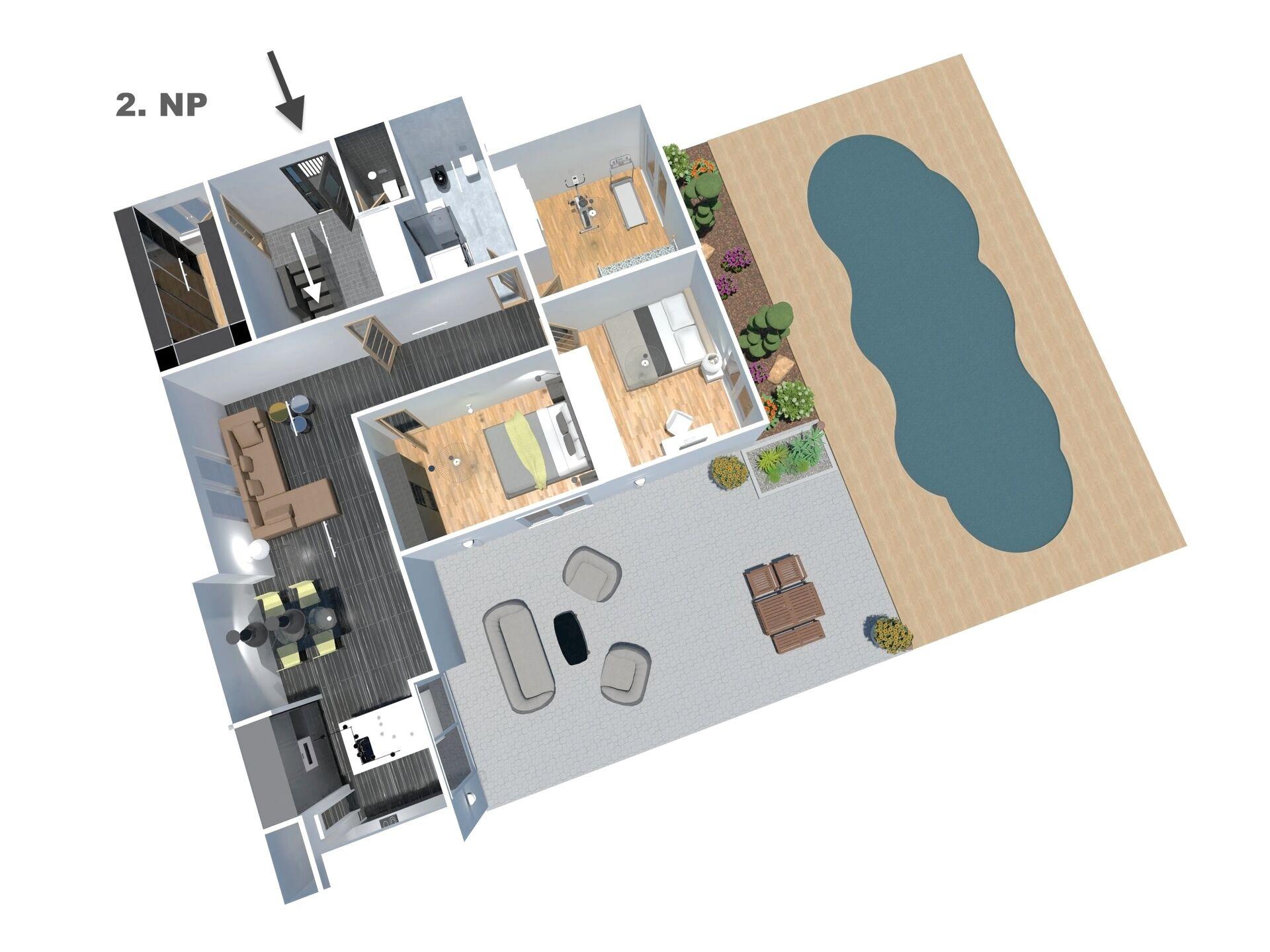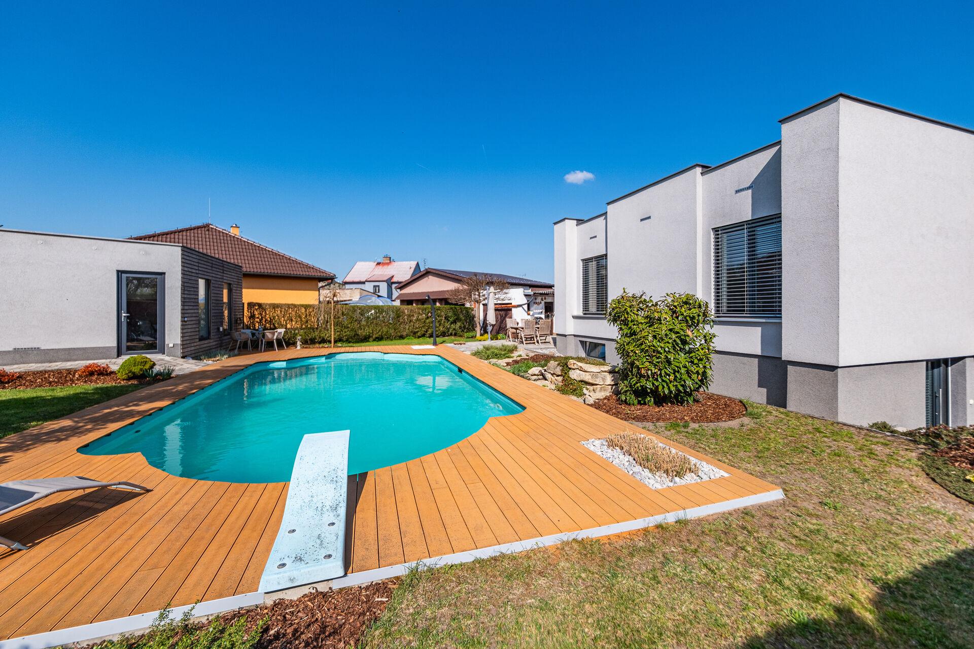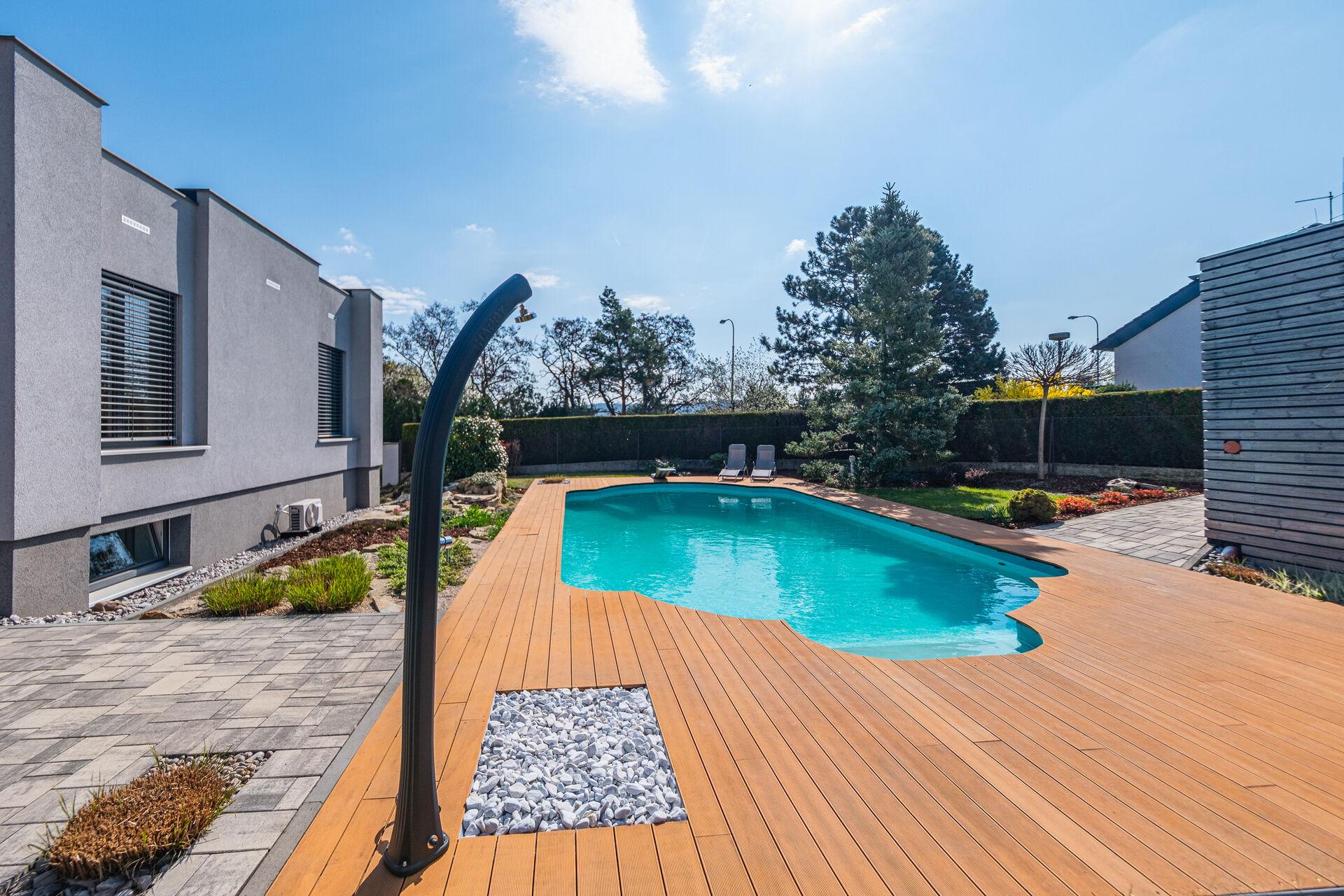 Bazén o objemu 70 m³ (11 × 5,5 m) s hloubkou až 2,5 m pod skokanským prknem je doslova soukromým letním resortem. Nová fólie, osvětlení i čistička, okolní terasa z kvalitního WPC (Gutta strong) – tady si léto opravdu užijete.