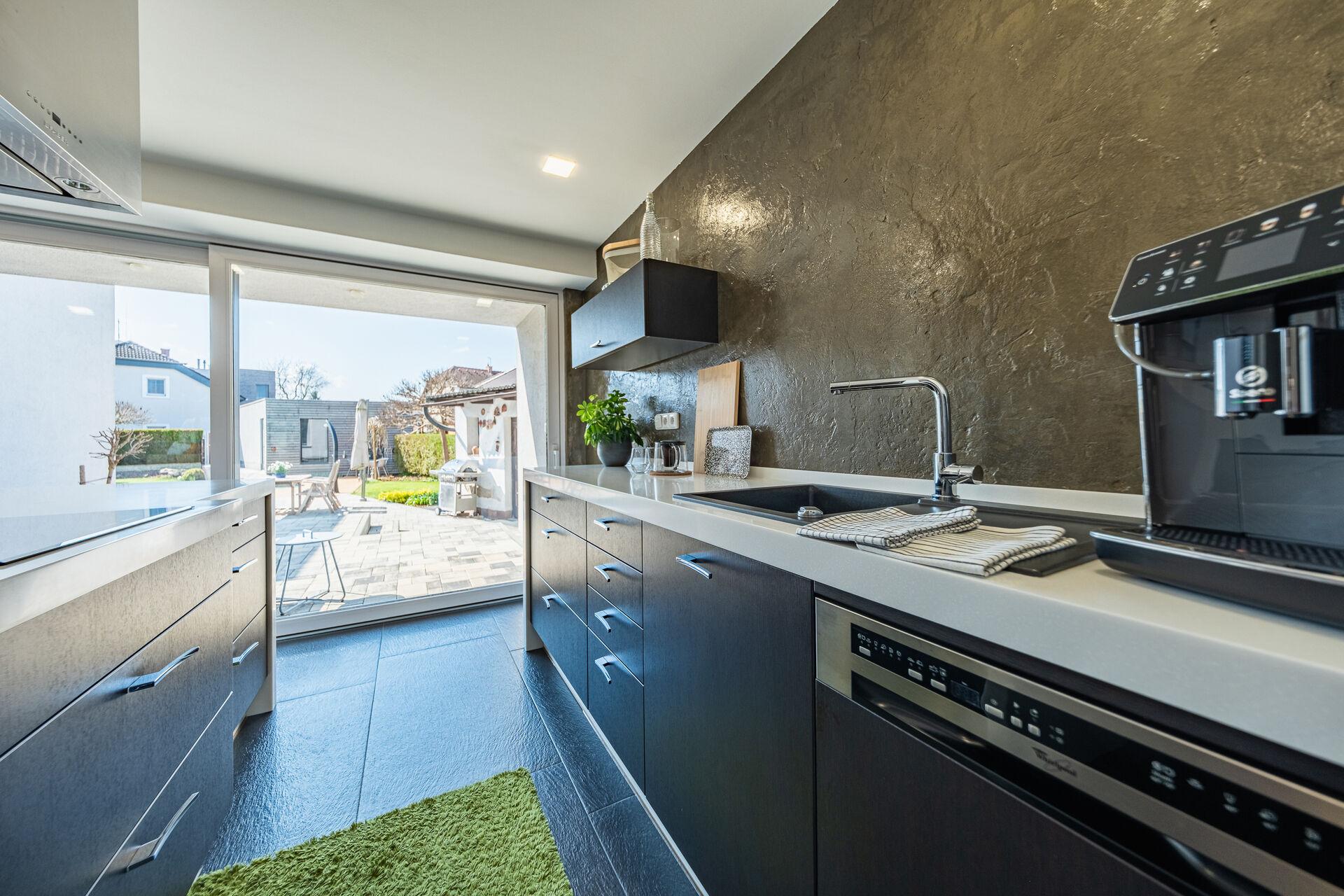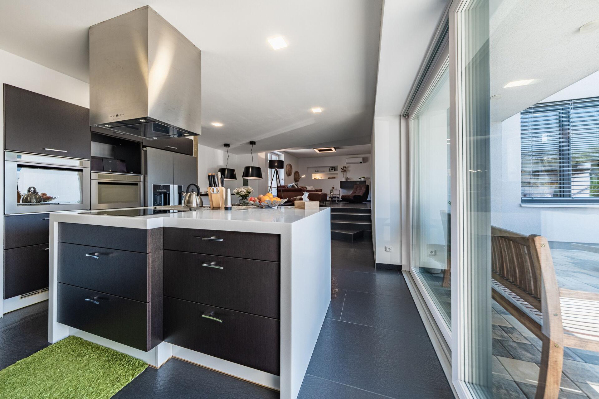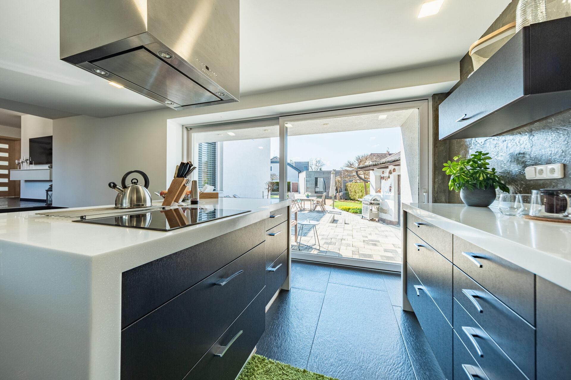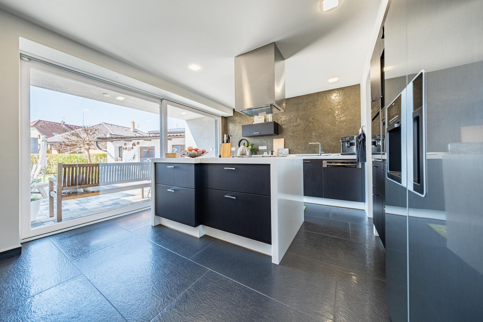 Dominantou domu je velkorysý obytný prostor s kuchyní na míru od Hanáka s pracovní deskou z umělého kamene – místo, kde se přirozeně setkává rodina i přátelé. Z kuchyně vstoupíte přímo na jižně orientovanou terasu, která vás zve k ranní kávě i večernímu posezení.