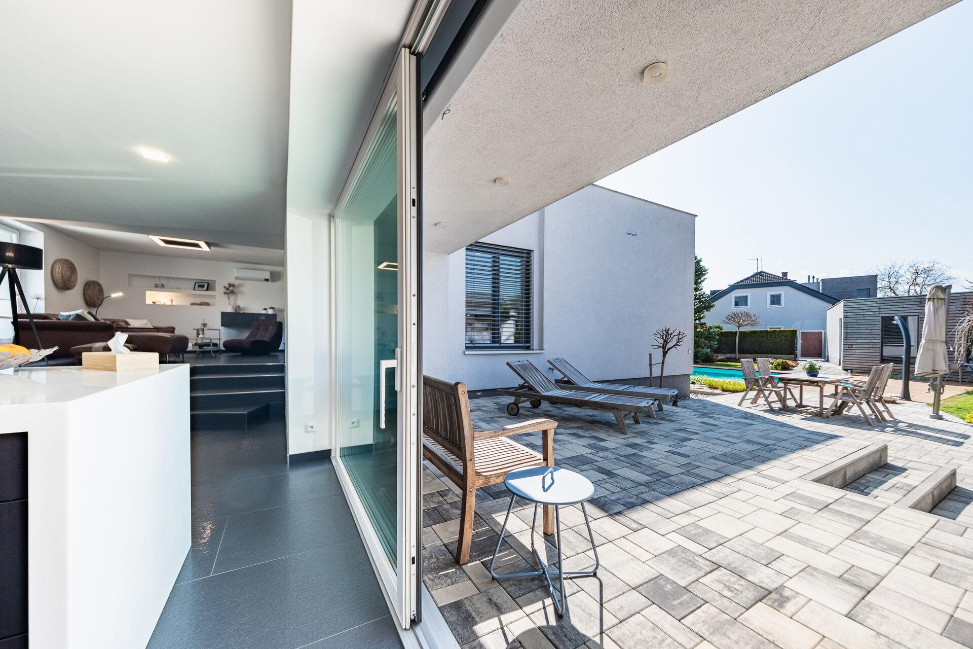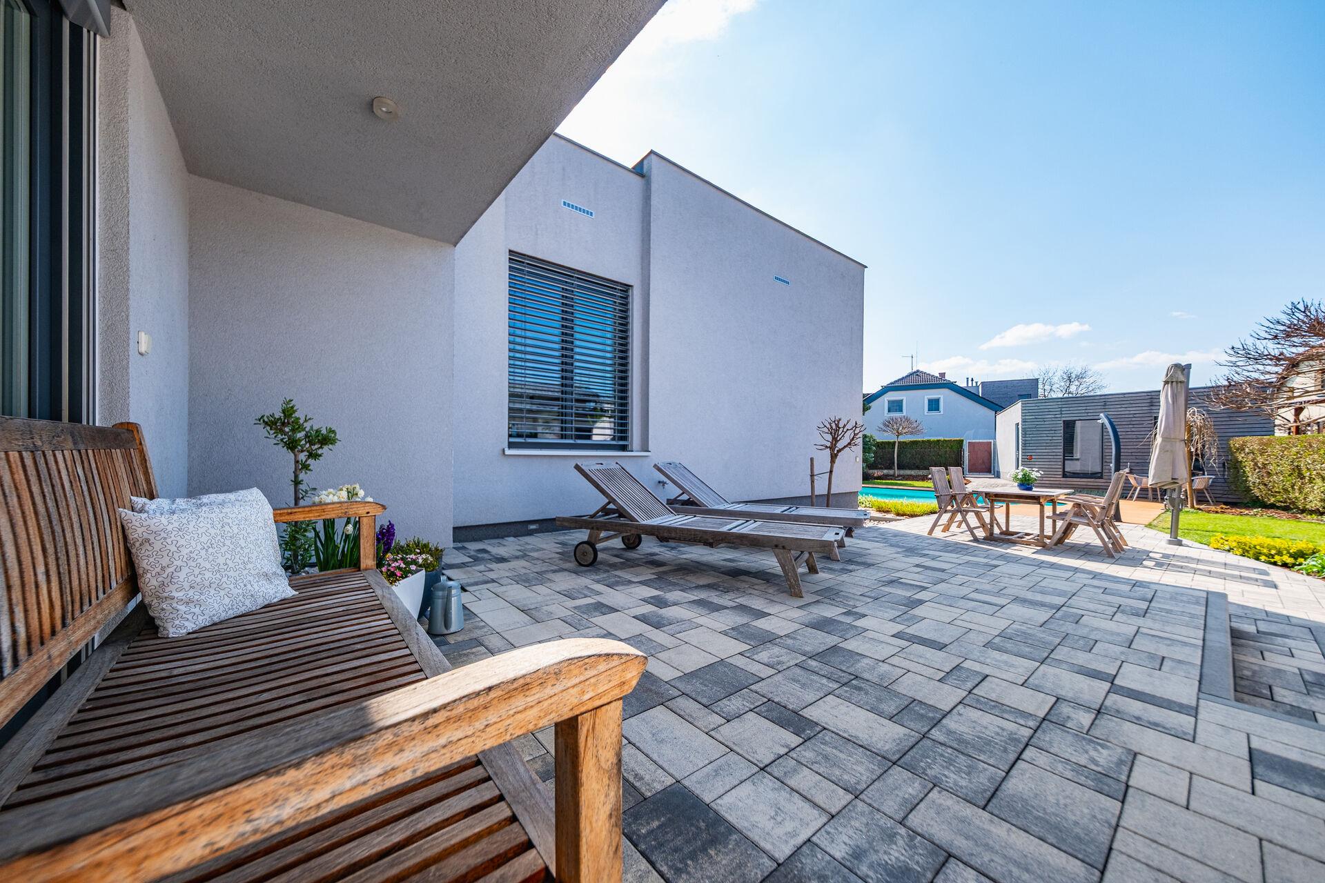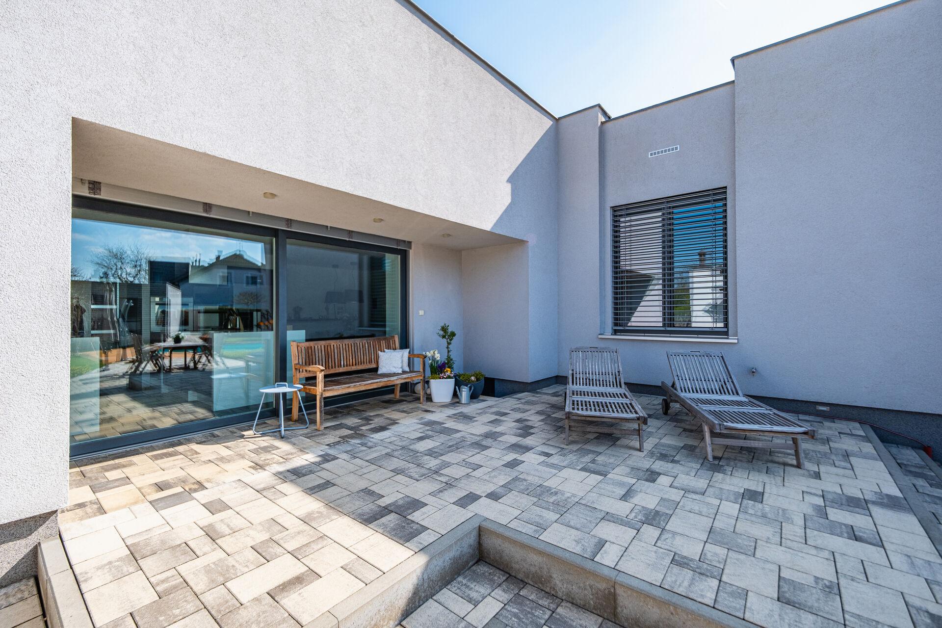 Dominantou domu je velkorysý obytný prostor s kuchyní na míru od Hanáka s pracovní deskou z umělého kamene – místo, kde se přirozeně setkává rodina i přátelé. Z kuchyně vstoupíte přímo na jižně orientovanou terasu, která vás zve k ranní kávě i večernímu posezení.