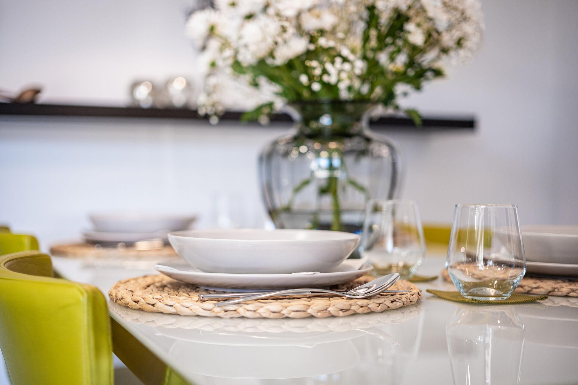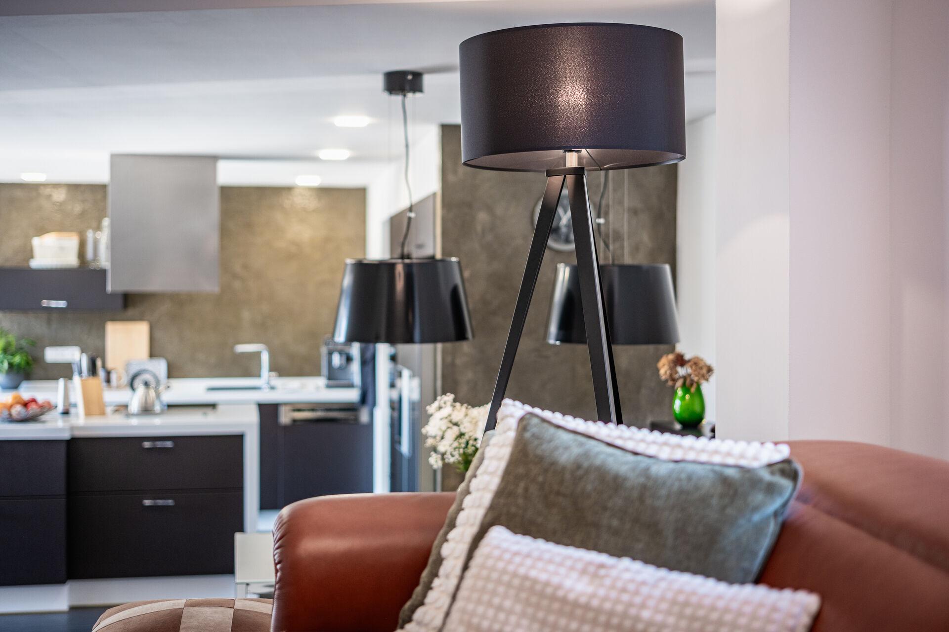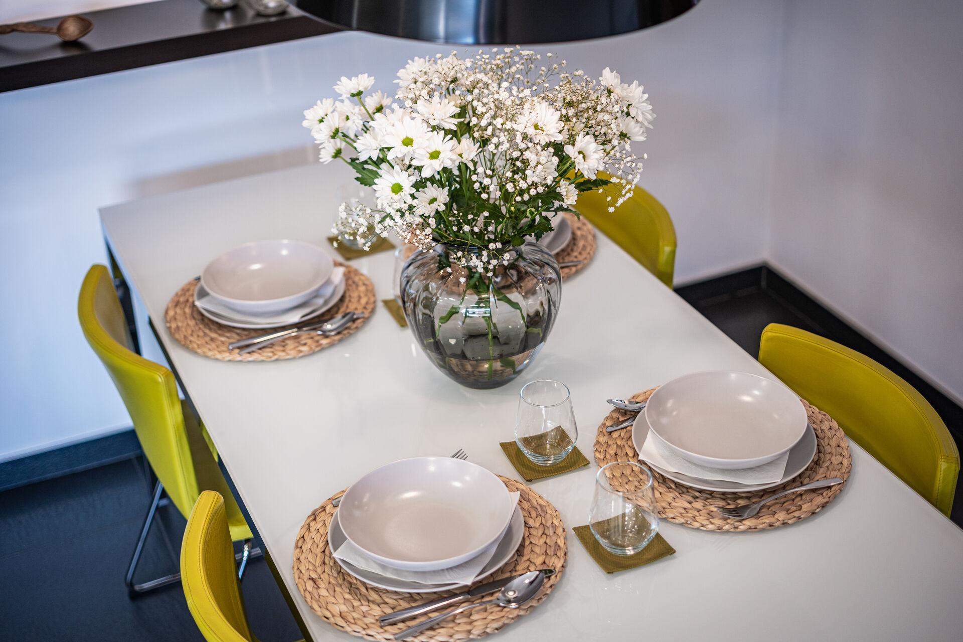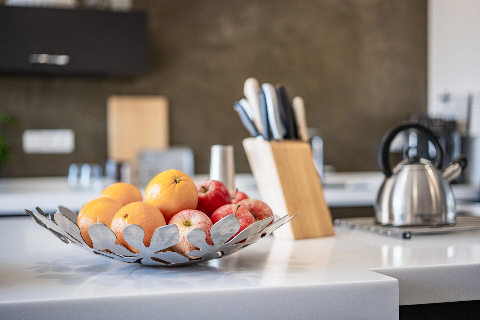 Dominantou domu je velkorysý obytný prostor s kuchyní na míru od Hanáka s pracovní deskou z umělého kamene – místo, kde se přirozeně setkává rodina i přátelé. Z kuchyně vstoupíte přímo na jižně orientovanou terasu, která vás zve k ranní kávě i večernímu posezení.