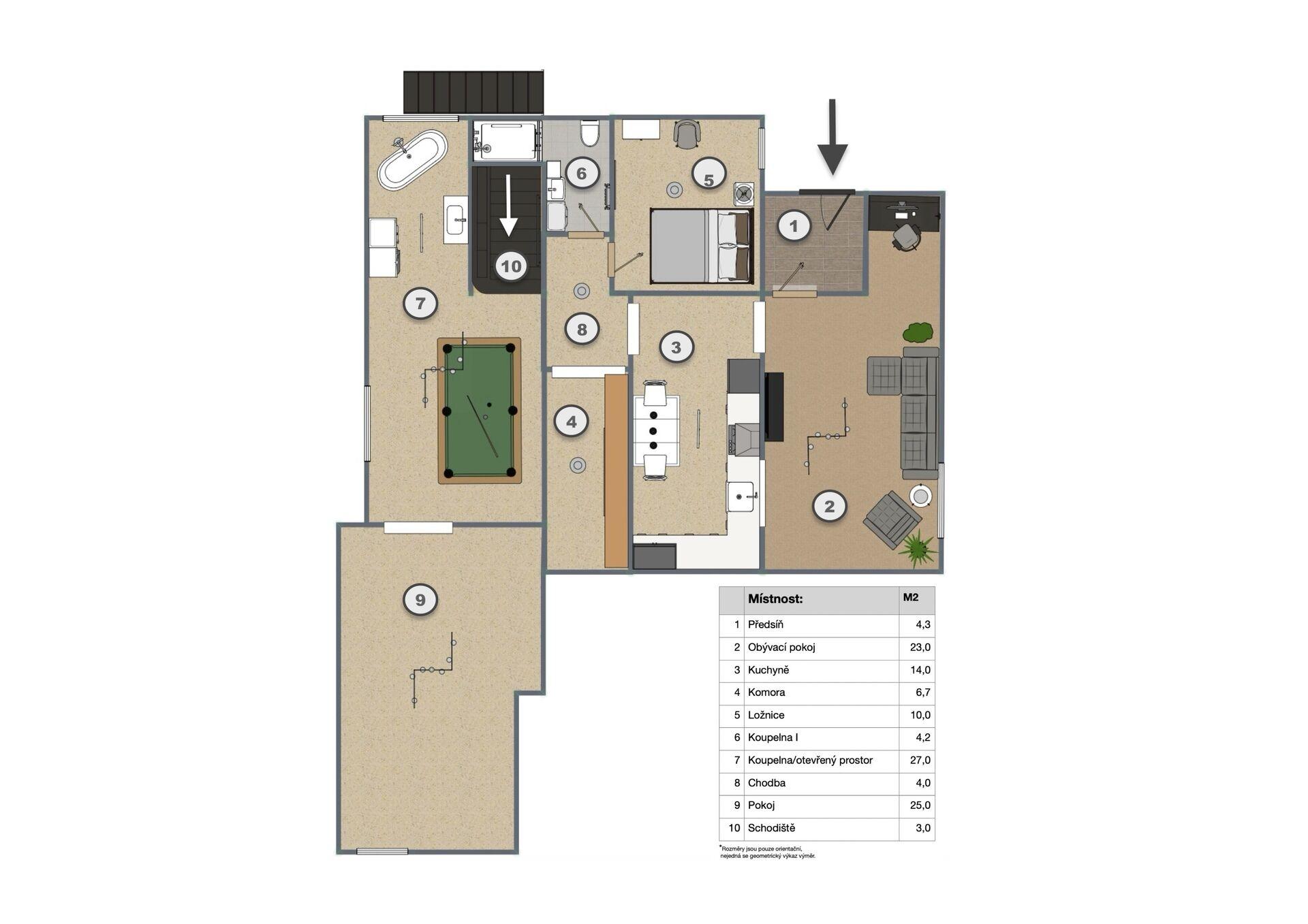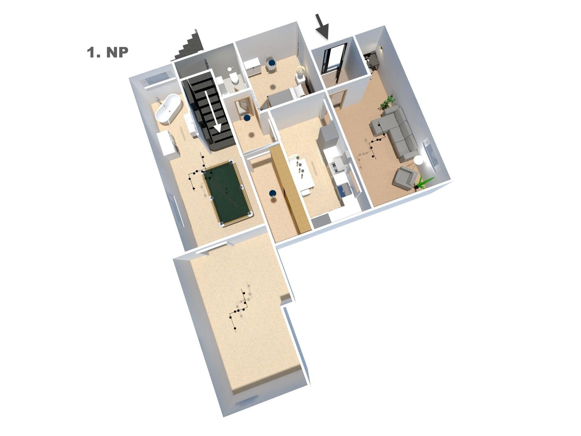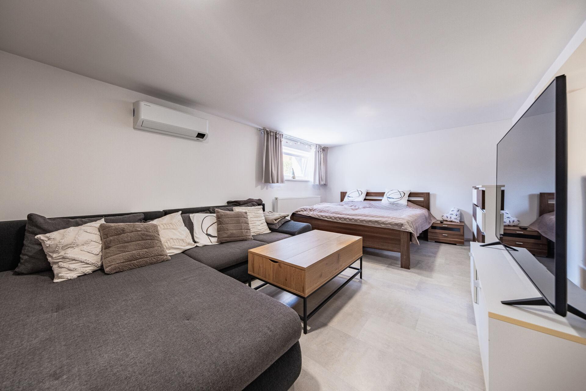 – v suterénu je samostatná jednotka 2+kk s jídelním prostorem a navazujícími místnostmi, které mohou sloužit jako pracovna, herna, wellness zóna nebo prostor pro vaše koníčky (výměra prostoru celkem 121,2m²).