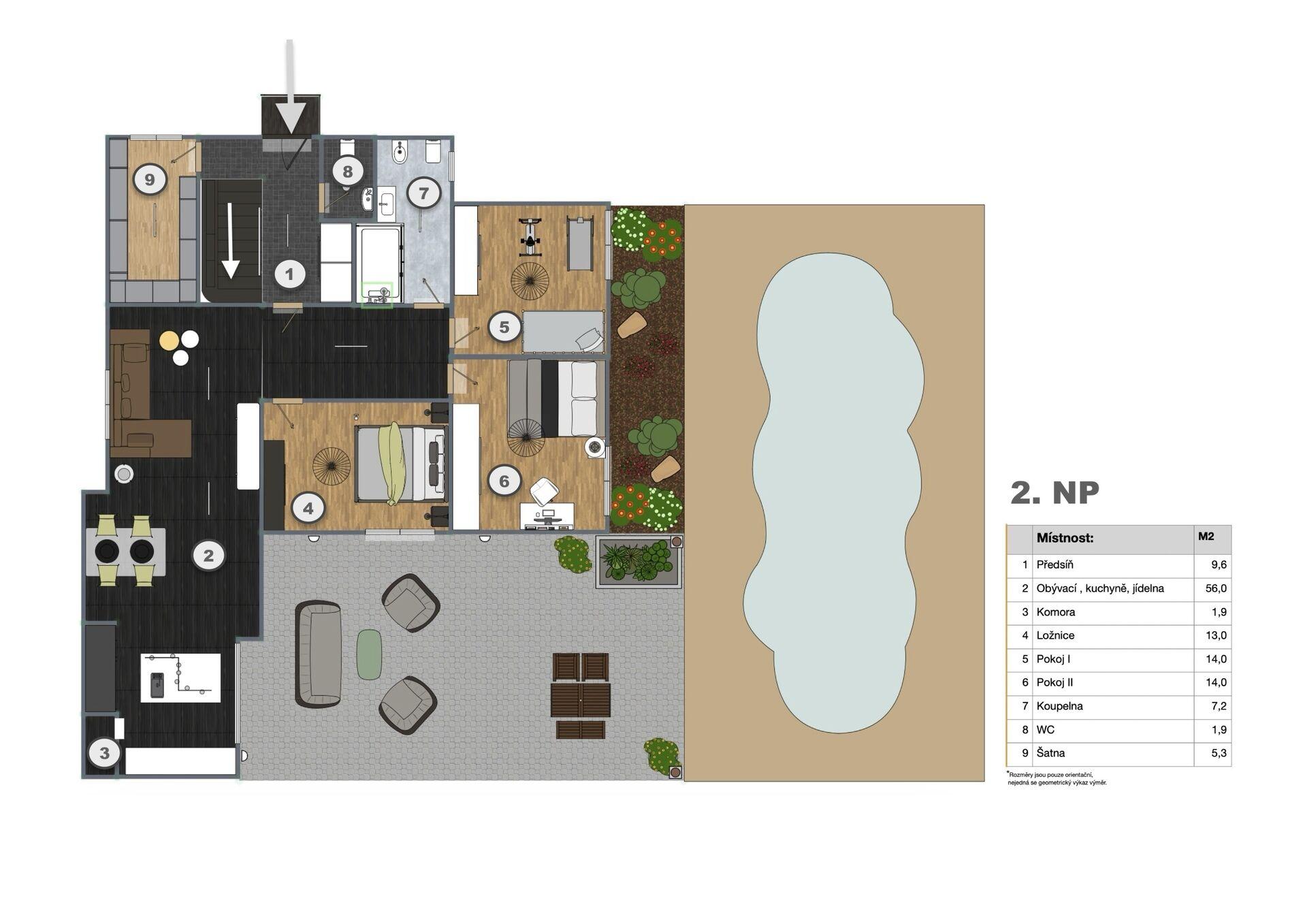 – v patře naleznete hlavní bytovou jednotku o dispozici 4+kk se šatnou a čtyřmi prostornými, světlými místnostmi (výměra prostoru celkem 122,9m²)