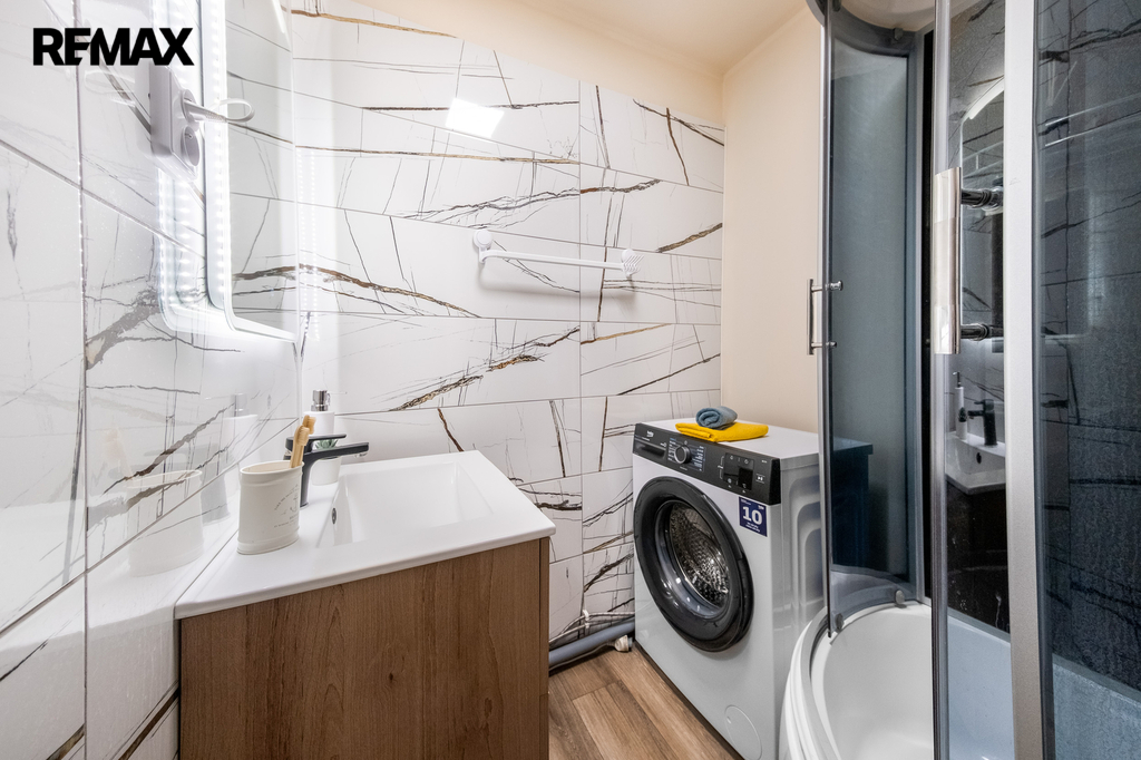Byt se pronajímá částečně vybavený. V interiéru byly provedeny úpravy zahrnující nové podlahy, kuchyňskou linku se spotřebiči, interiérové dveře a sádrokartonové prvky. Koupelna je spojena s toaletou a nabízí masážní sprchový kout. Okna a balkonové dveře jsou nová plastová.