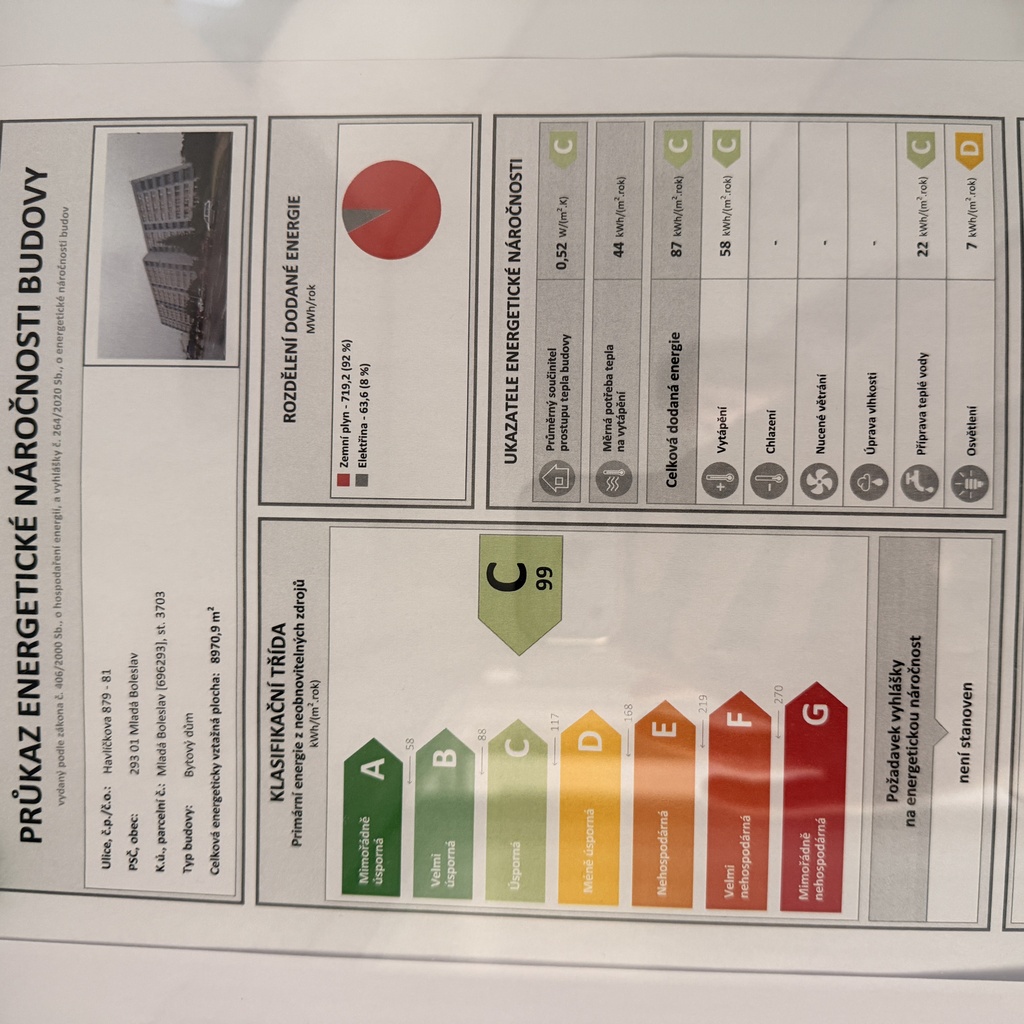 - Ukazatel energetické náročnosti budovy: 99 kWh/m²