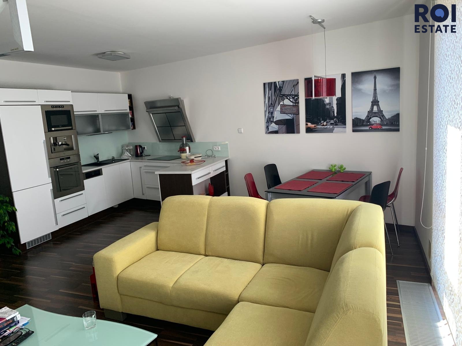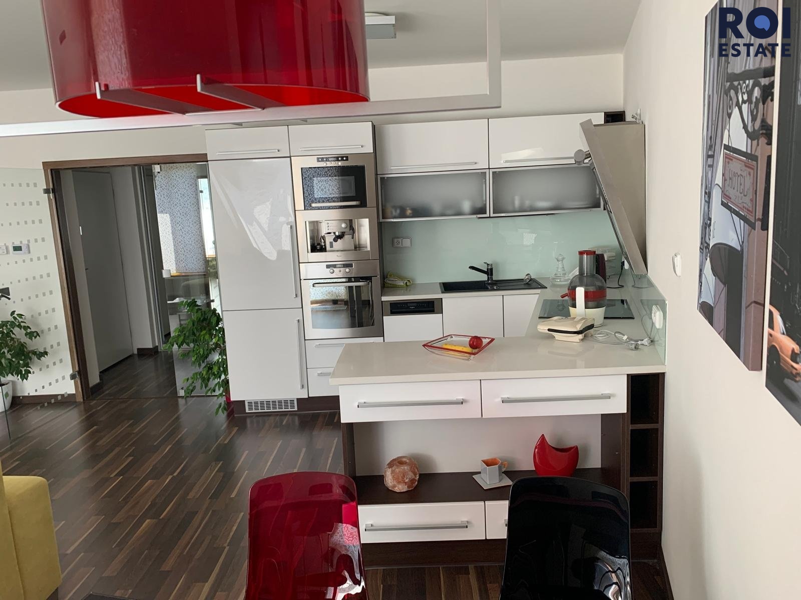 * moderní kuchyňská linka se spotřebiči (trouba, varná deska, digestoř, myčka, lednice),
