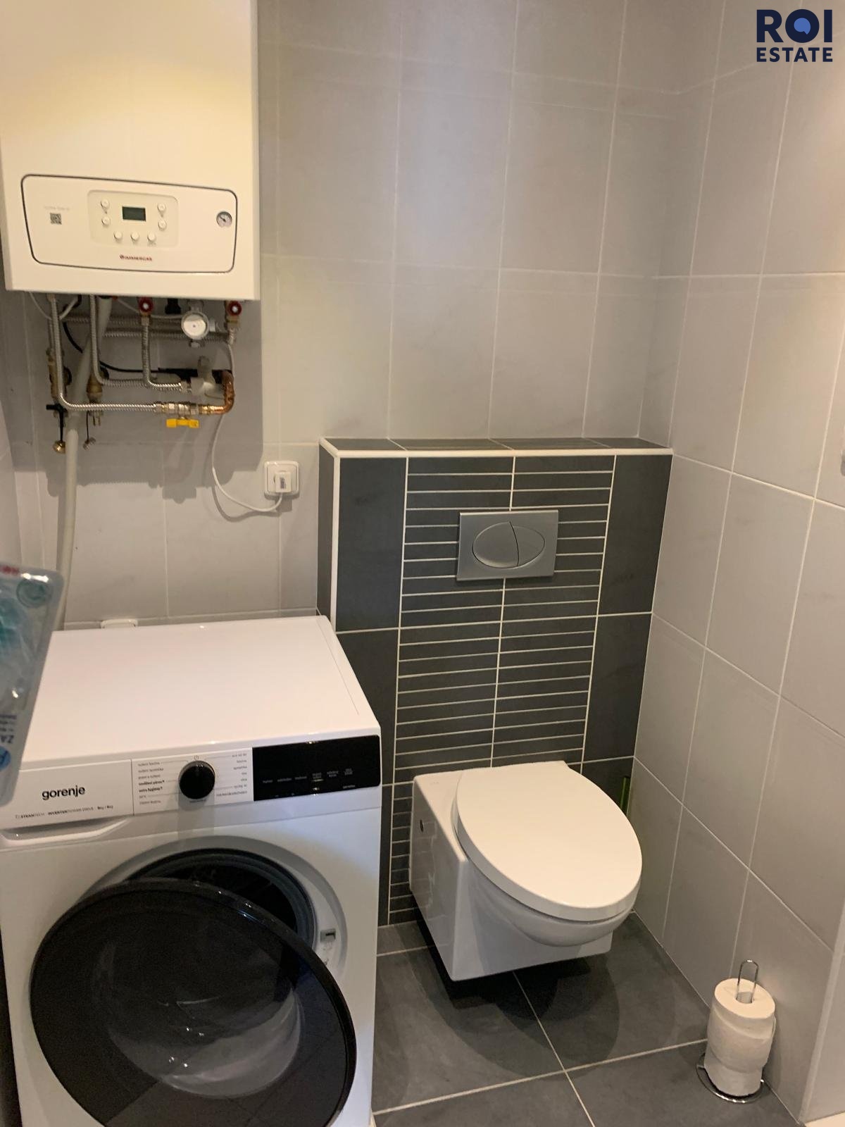 * koupelna s vanou, toaletou a pračkou