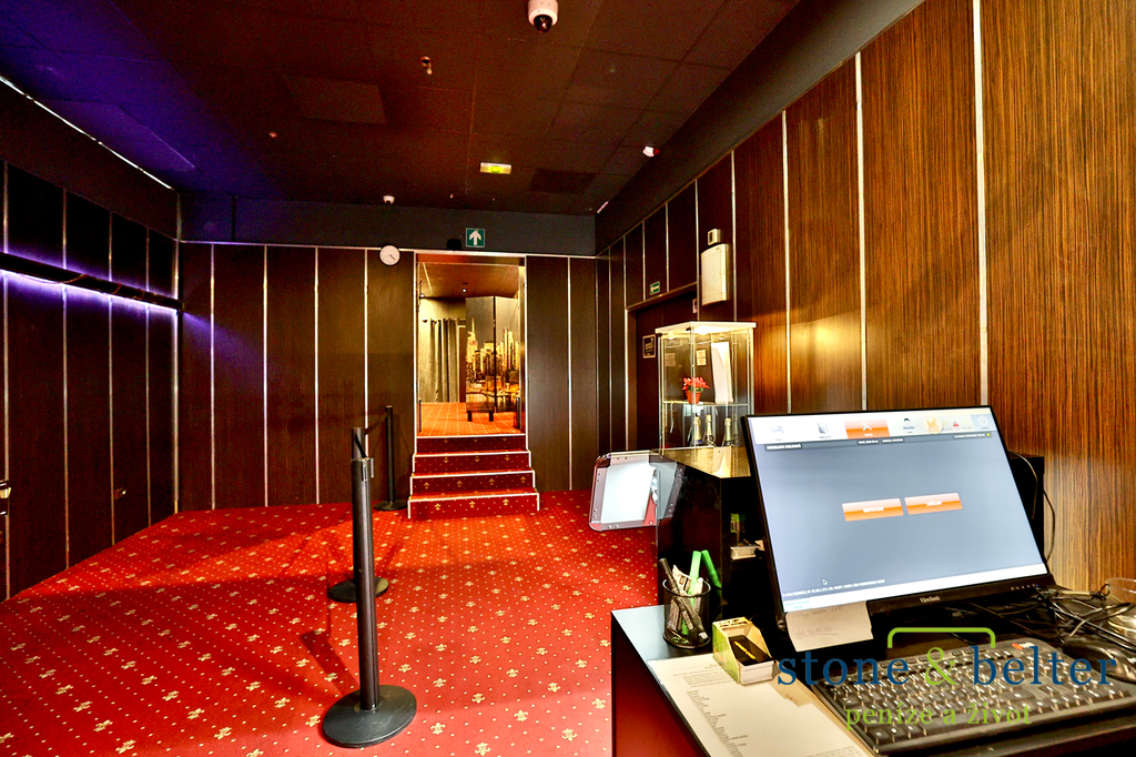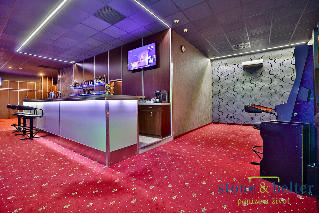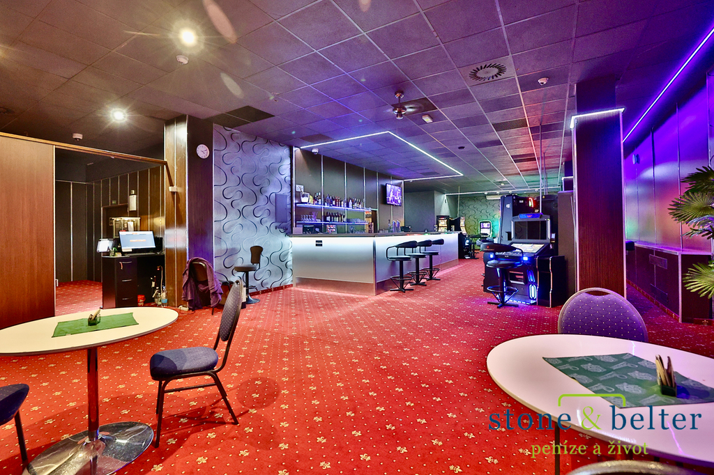 Aktuální členění zahrnuje hlavní místnost s barem a salonek, prostorné zázemí (kancelář, chodba a sklad) a sociální zařízení. Prostory jsou klimatizované, spolehlivé a rychlé připojení na internet zajišťuje optický kabel.