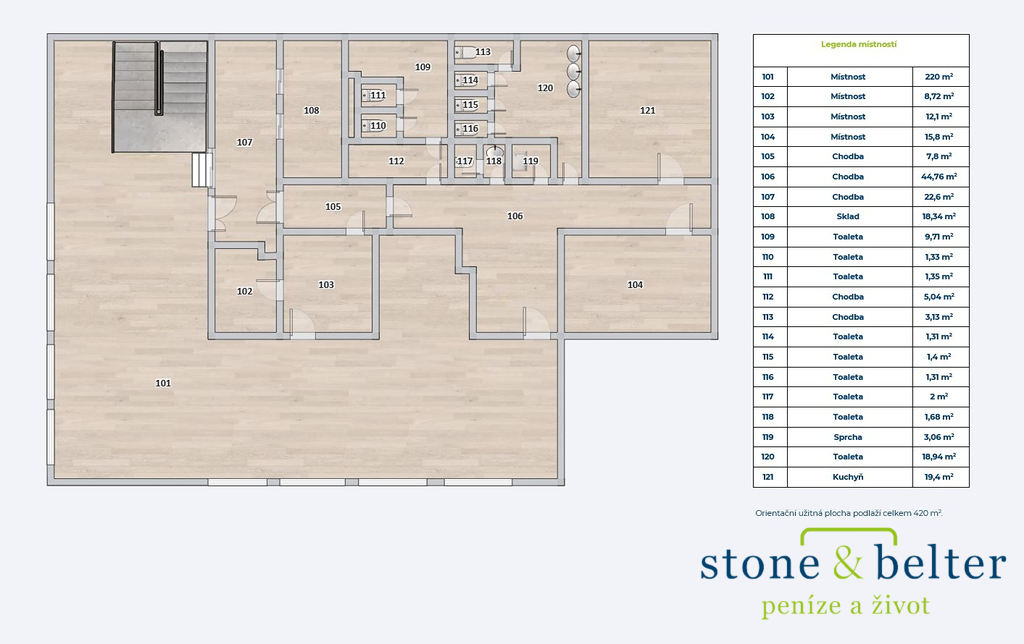 Interiér nabízí velkorysých 420 m² a nachází se v prvním patře komerční budovy umístěné v lokalitě s plnou občanskou vybaveností a dobrou dostupností do centra města.