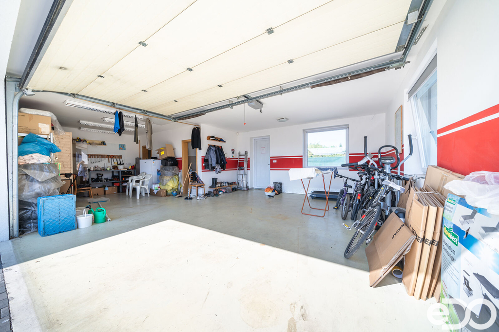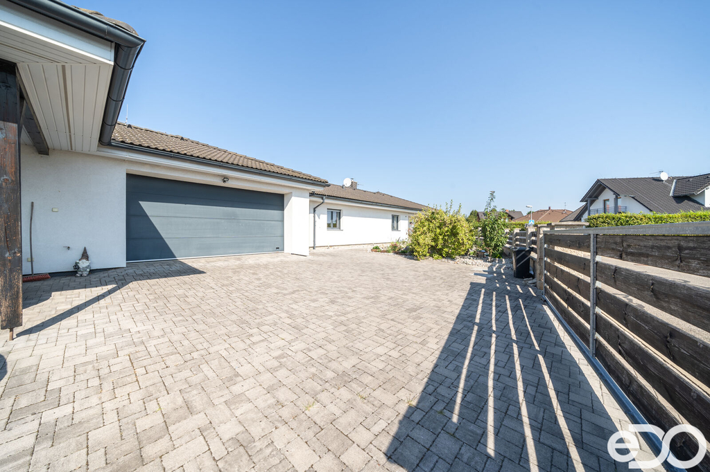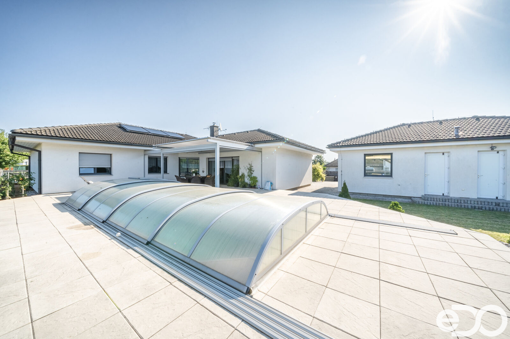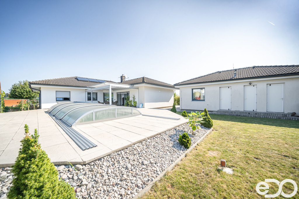 Vytápění domu je zajištěno podlahovým topením na tepelné čerpadlo a solárním systémem na ohřev vody. V domě je také krb. Vysoký nadstandard domu potvrzují i elektricky ovládané venkovní žaluzie. Dalším obrovským plusem je prostorná garáž s dílnou. Zde je myšleno i na zimní časy a je i zde podlahové vytápění. V dílně také nalezneme toaletu, spíž a saunu. Auta je možné parkovat v garáži nebo na krytých parkovacích stáních. Zahrada je z části okrasná i užitková.