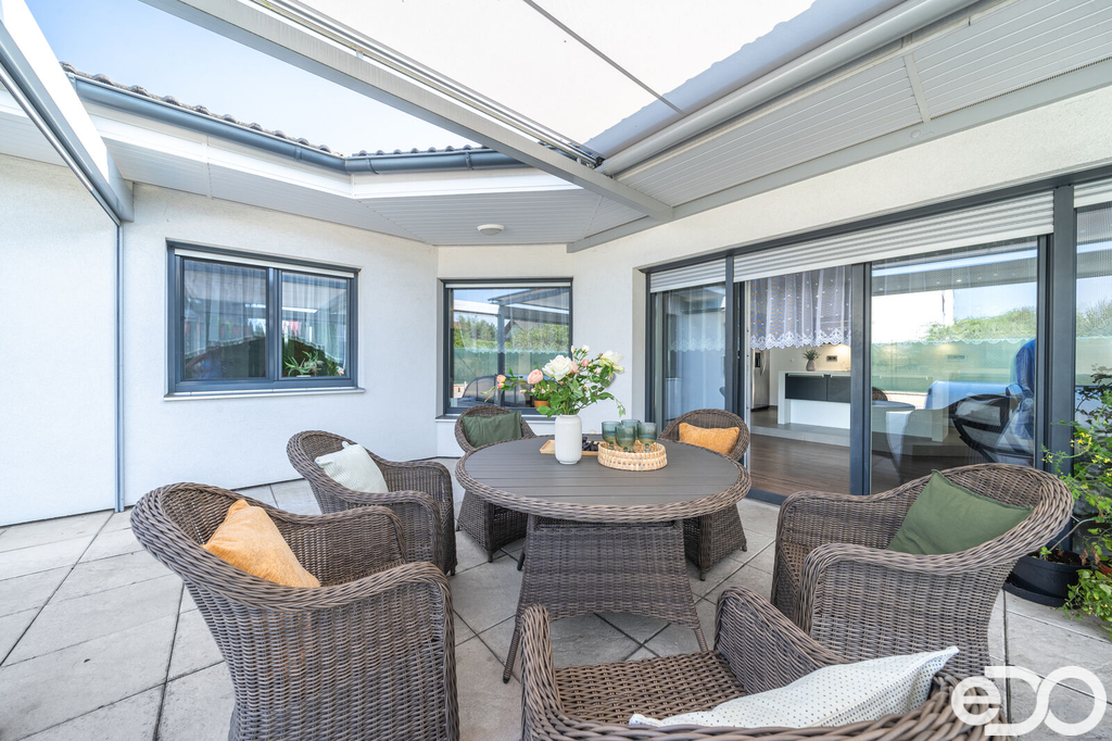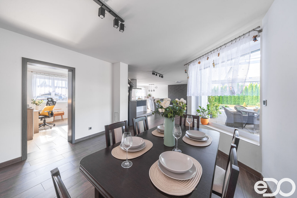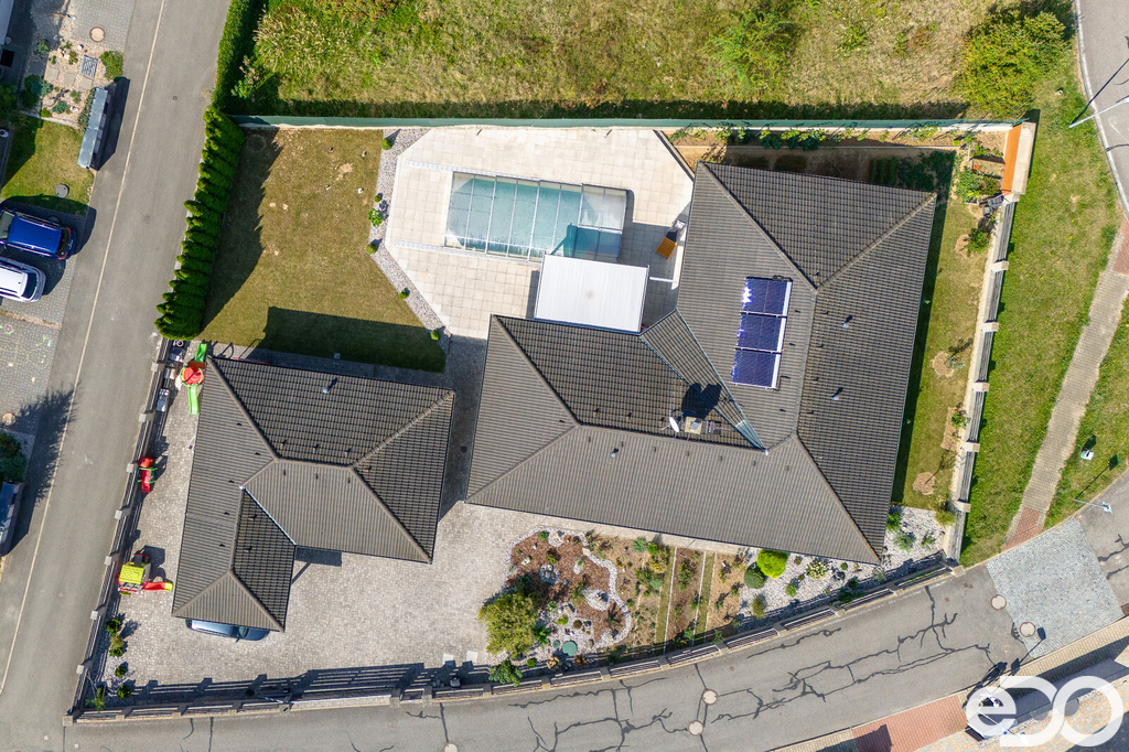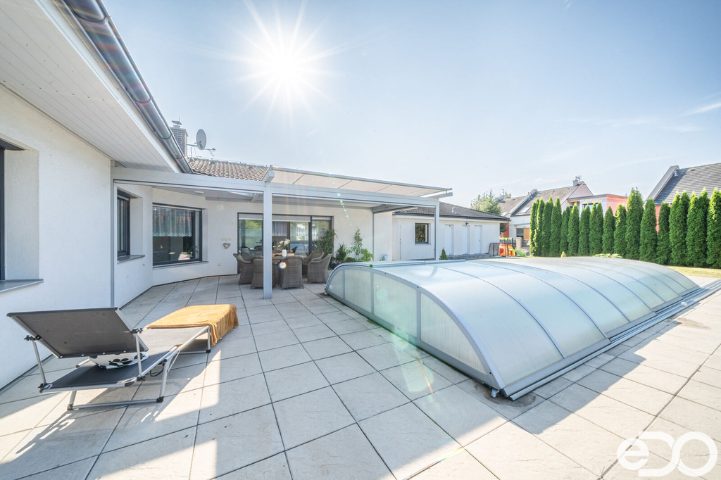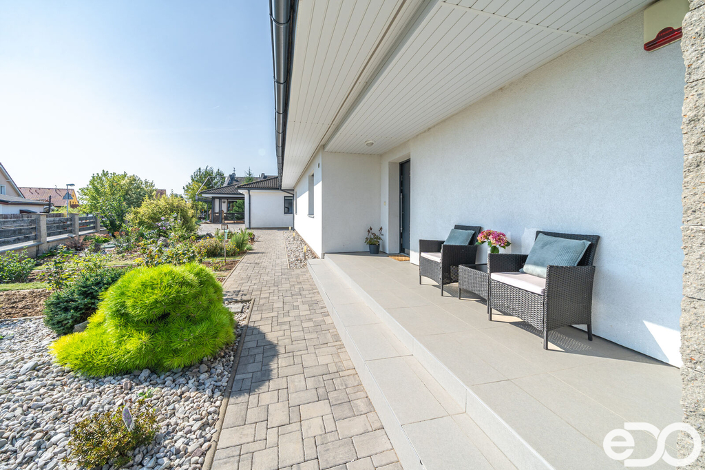 Vytápění domu je zajištěno podlahovým topením na tepelné čerpadlo a solárním systémem na ohřev vody. V domě je také krb. Vysoký nadstandard domu potvrzují i elektricky ovládané venkovní žaluzie. Dalším obrovským plusem je prostorná garáž s dílnou. Zde je myšleno i na zimní časy a je i zde podlahové vytápění. V dílně také nalezneme toaletu, spíž a saunu. Auta je možné parkovat v garáži nebo na krytých parkovacích stáních. Zahrada je z části okrasná i užitková.